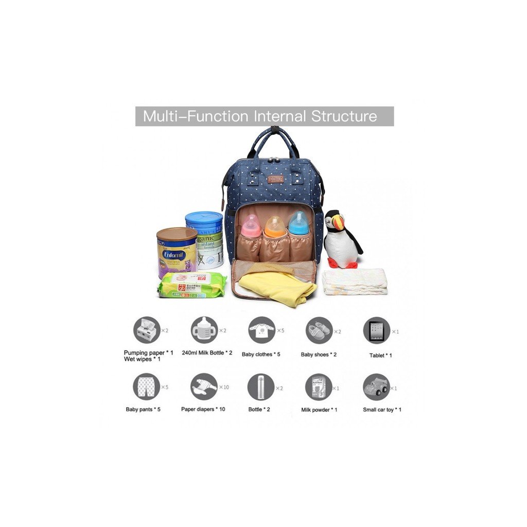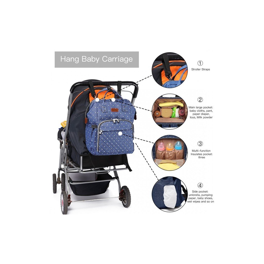 Batoh je prispôsobený potrebám mamičiek, ktoré potrebujú mať so sebou všetko, čo ich dieťa vyžaduje. Najmä ak sú na prechádzke, či práve cestujú. Vnútro batohu je priestranné a veľké. Uschová väčšie predmety ako hračky, plienky, nádoby sušeného mlieka ale aj vaše osobné veci. Predné vonkajšie vrecko je určené na 3 fľašky s pitím. Väčšiu záťaž odľahčia mäkké vystužené popruhy na ramená. Batoh je z pevne tkanej textílie s bodkovanou potlačou, ktorá je odolná voči preťaženiu. Uzatvára sa zipsom a možno ho nosiť aj na kočíku špeciálnymi popruhmi.