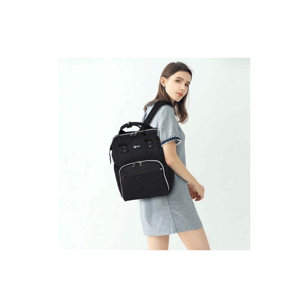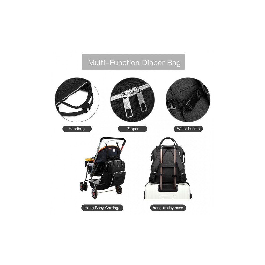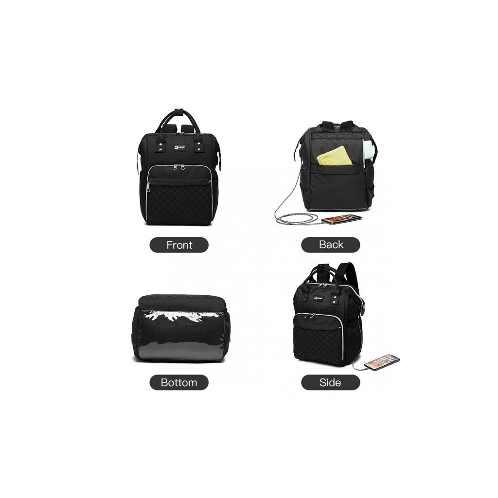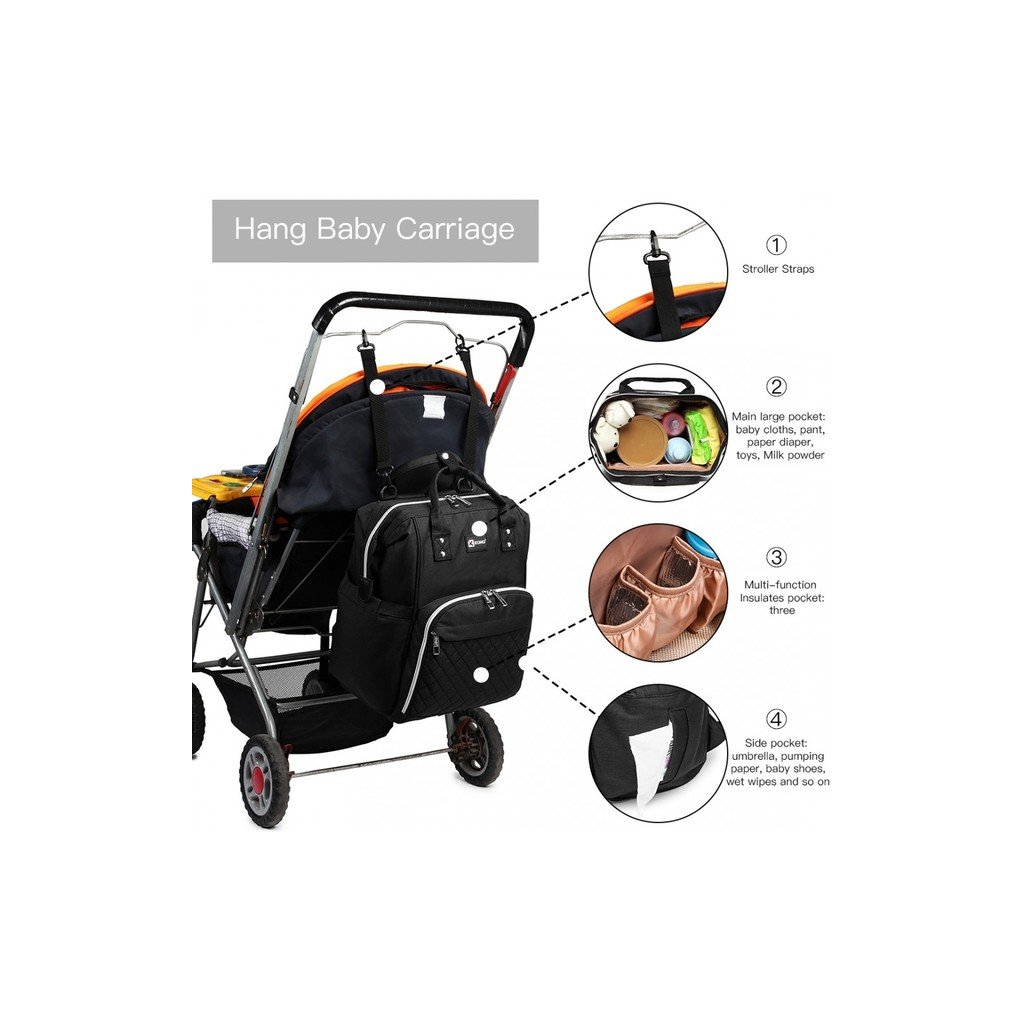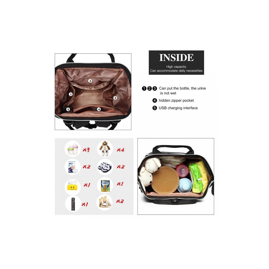 Batoh je prispôsobený potrebám mamičiek, ktoré potrebujú mať so sebou všetko, čo ich dieťa vyžaduje. Najmä, ak sú na prechádzke, či práve cestujú. Vnútro ruksaku je priestranné a veľké. Uschová väčšie predmety ako hračky, plienky, nádobu sušeného mlieka, oblečenie, ale aj vaše osobné veci. Predné vonkajšie vrecko je určené na 3 fľašky s pitím. Väčšiu záťaž odľahčia mäkké vystužené popruhy na ramená. Batoh je z pevne tkanej nylonovej textílie, ktorá je odolná voči preťaženiu. Uzatvára sa zipsom a možno ho nosiť aj na kočíku špeciálnymi popruhmi. Navyše má tento ruksak špeciálne USB pripojenie, takže ani váš telefón neostane bez šťavy.