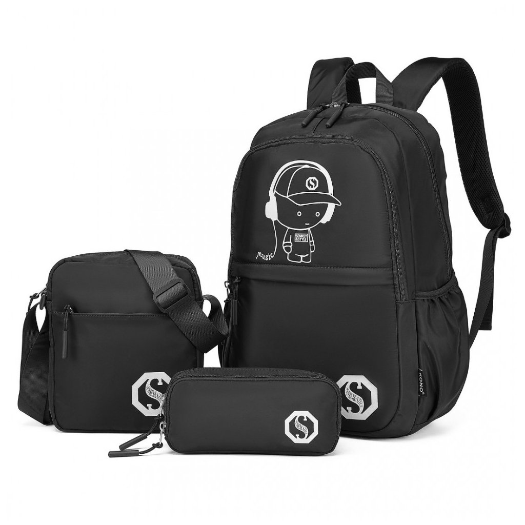 Tento štýlový čierny set, ktorý obsahuje batoh, crossbody tašku a peračník, je ideálny pre aktívnych ľudí, ktorí potrebujú funkčnosť a originálny dizajn. Svietiaci prvok, ktorý ožíva v tme, dodáva setu jedinečný charakter a zároveň zlepšuje vašu viditeľnosť v znížených svetelných podmienkach.