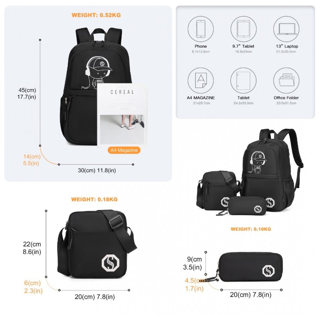 Batoh poskytuje dostatok priestoru s priehradkami na všetky vaše veci, od elektroniky až po fľaše, a vystužené nastaviteľné popruhy zaručujú maximálne pohodlie pri nosení. Crossbody taška je kompaktná a praktická, ideálna na drobnosti, ktoré chcete mať vždy po ruke. Peračník je skvelým doplnkom na organizáciu vašich pomôcok. Tento čierny set pôsobí minimalisticky a štýlovo, čo z neho robí perfektný doplnok do školy, cestovanie alebo každodenné použitie.