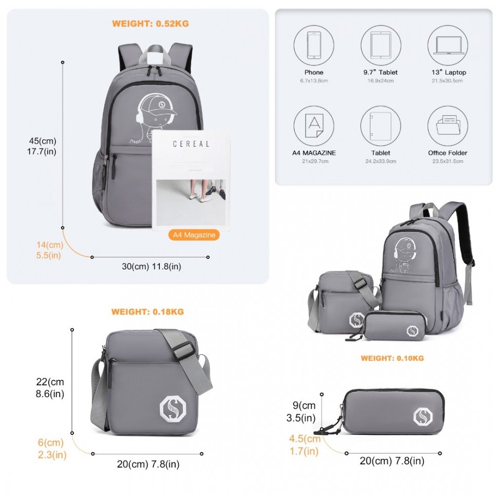 Tento štýlový šedý set pozostáva z batohu, crossbody tašky a peračníka, ktoré spolu vytvárajú ideálny doplnok pre moderného a aktívneho človeka. Vyniká svietiacim dizajnom, ktorý sa rozžiari v tme, čím nielen pridáva originálny štýl, ale aj zlepšuje vašu viditeľnosť počas znížených svetelných podmienok.