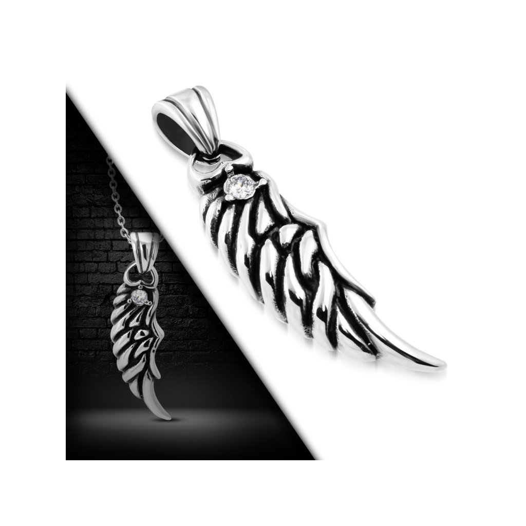 Krásna dámska retiazka s príveskom vyrobená z kvalitnej chirurgickej ocele. Prívesok má tvar anjelského krídla, ktoré je potiahnuté tmavou patinou a zdobené čírym očkom. Anjelské motívy sú veľmi obľúbeným a často vyhľadávaným motívom šperkov. Určite ním každej dáme urobíte radosť. Veľmi ľahko sa dajú doplniť s inými šperkami ako sú napríklad náušnice alebo náramok. Oceľové šperky sa tešia svojej popularite, pretože si zachovávajú svoju farbu a lesk a nepotrebujú žiadnu špeciálnu starostlivosť. Oceľ je tiež hypoalergénny materiál, ktorý je vhodný na bežné každodenné nosenie. Ak Vám nevyhovuje dĺžka retiazky, pri tomto šperku máte na výber dĺžku retiazky podľa seba.