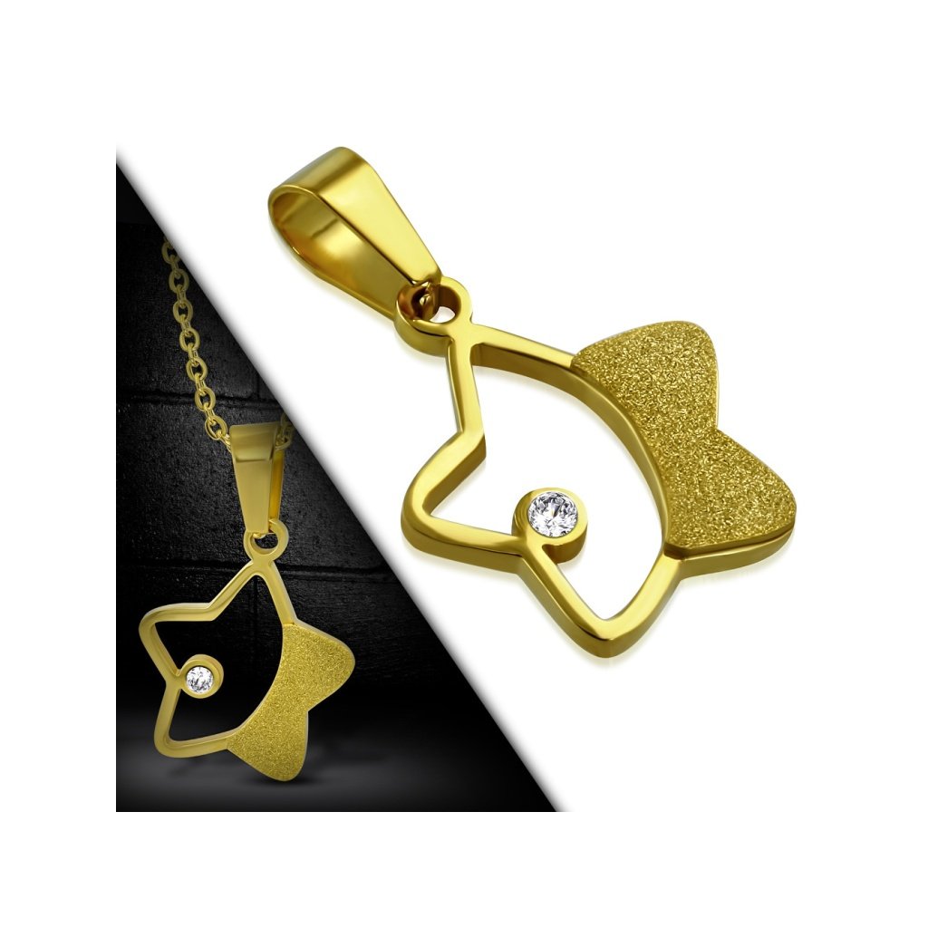 Krásny dámsky prívesok a retiazka z chirurgickej ocele v zlatej farbe. Prívesok je v tvare hviezdy ozdobenej malým čírym očkom a povrchovou úpravou star dust, ktorá vyvoláva dojem hviezdneho prachu. Prívesok pôsobí nežne a je vhodný pre všetky dámy bez ohľadu na vek. Je vhodný aj ako darček. Materiál prívesku aj retiazky je chirurgická oceľ, ktorá je pevná a odolná. Nevyžaduje si žiadnu špeciálnu starostlivosť. Zapínanie retiazky je na klasickú karabínku. Ak Vám nevyhovuje dĺžky retiazky, pri tomto produkte si zvoliť Vami požadovanú dĺžku.