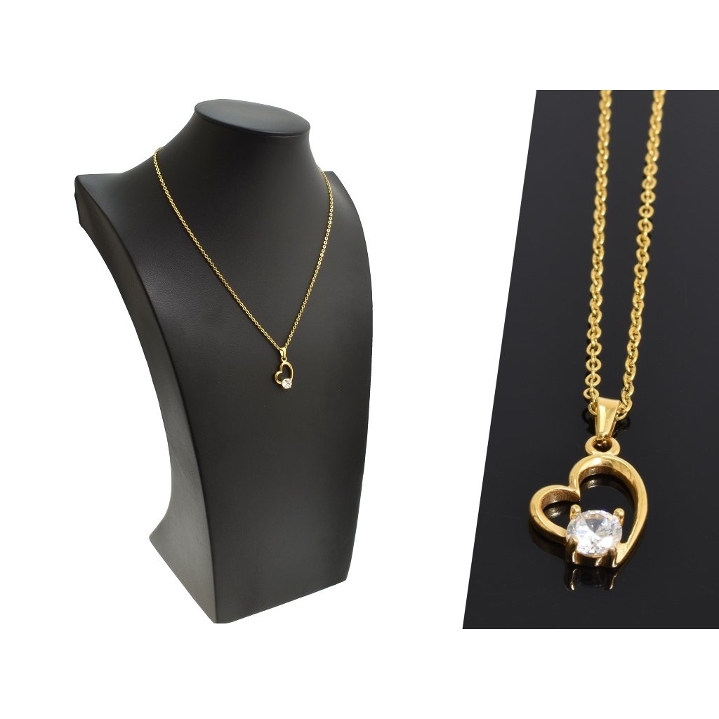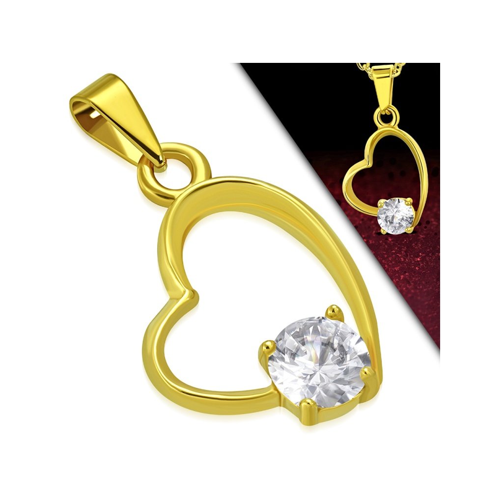 Dámska retiazka s príveskom srdce z chirurgickej ocele v zlatej farbe. Prívesok je v tvare asymetrického srdiečka, vnútri ktorého je väčšie očko čírej farby. Prívesok pôsobí nežne a romanticky a je vhodný aj ako darček, ktorý určite poteší! Výborne sa dá zladiť s náušnicami alebo s náramkom. Materiál prívesku aj retiazky je chirurgická oceľ, ktorá je antialergická, čo je veľmi dôležitý faktor pri výbere šperkov. Oceľ si nevyžaduje žiadnu špeciálnu starostlivosť. Pri tomto šperku si viete vybrať dĺžku retiazky ak Vám nevyhovuje jej základná dĺžka.