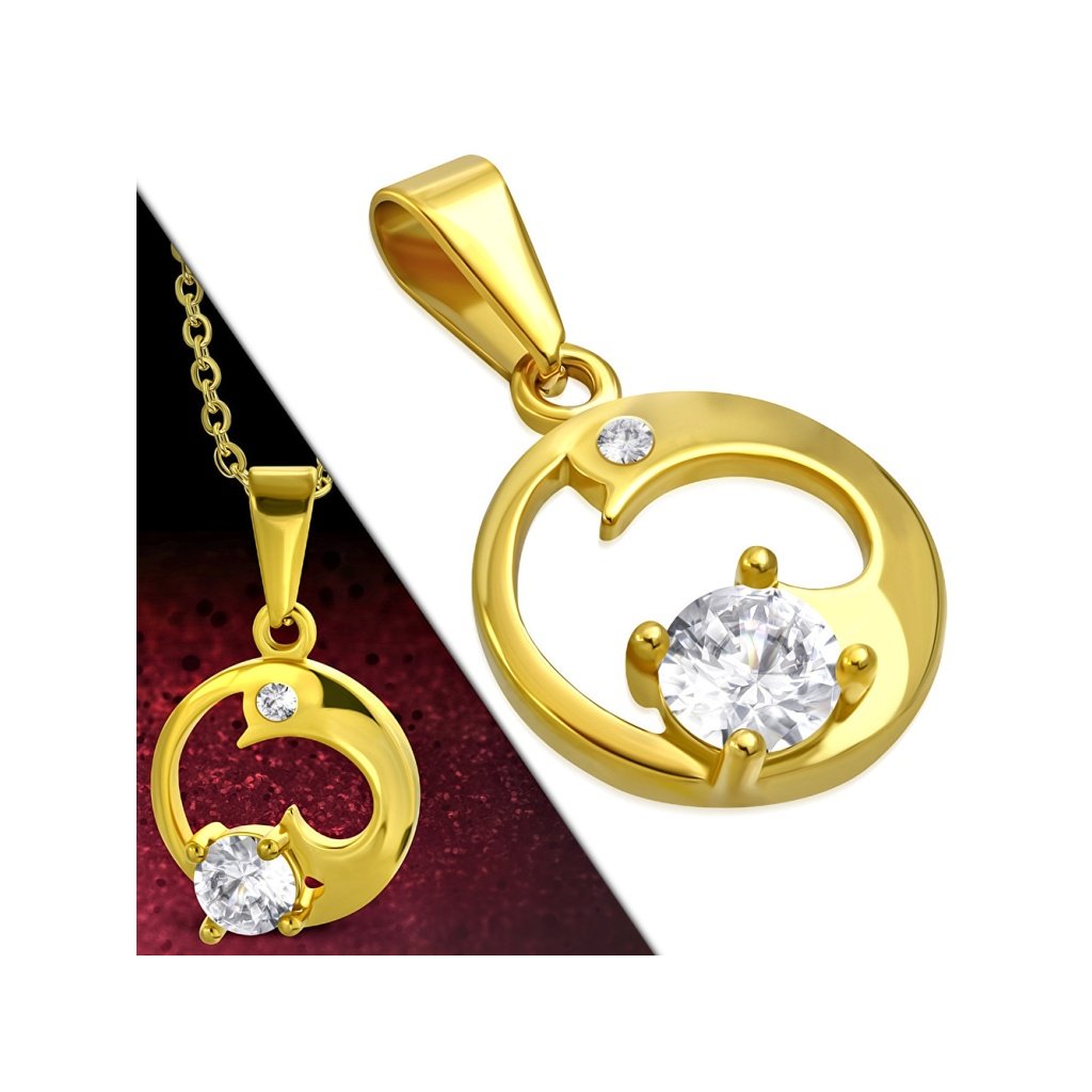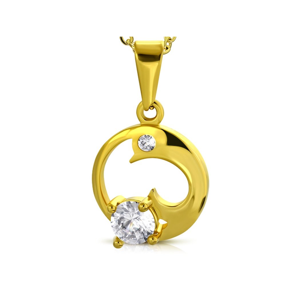 Krásny dámsky prívesok vyrobený z chirurgickej ocele v zlatej farbe. Prívesok má okrúhly tvar, v ktorom ak sa zapozeráte, uvidíte znázorneného delfína. Prívesok je zdobený väčším čírym očkom a menším, ktoré predstavuje oko delfína. Retiazka s príveskom je vhodná pre všetky vekové kategórie žien a ľahko sa doplní napríklad náušnicami alebo náramkom. Celý šperk je vyrobený z kvalitnej chirurgickej ocele, ktorá je pevná a odolná. Nevyžaduje si žiadnu špeciálnu starostlivosť. Chirurgická oceľ je hypoalergénna, preto sa nemusíte obávať alergických reakcií. Ak Vám nevyhovuje dĺžka retiazky, pri tomto šperku máte na výber dĺžku retiazky podľa seba.