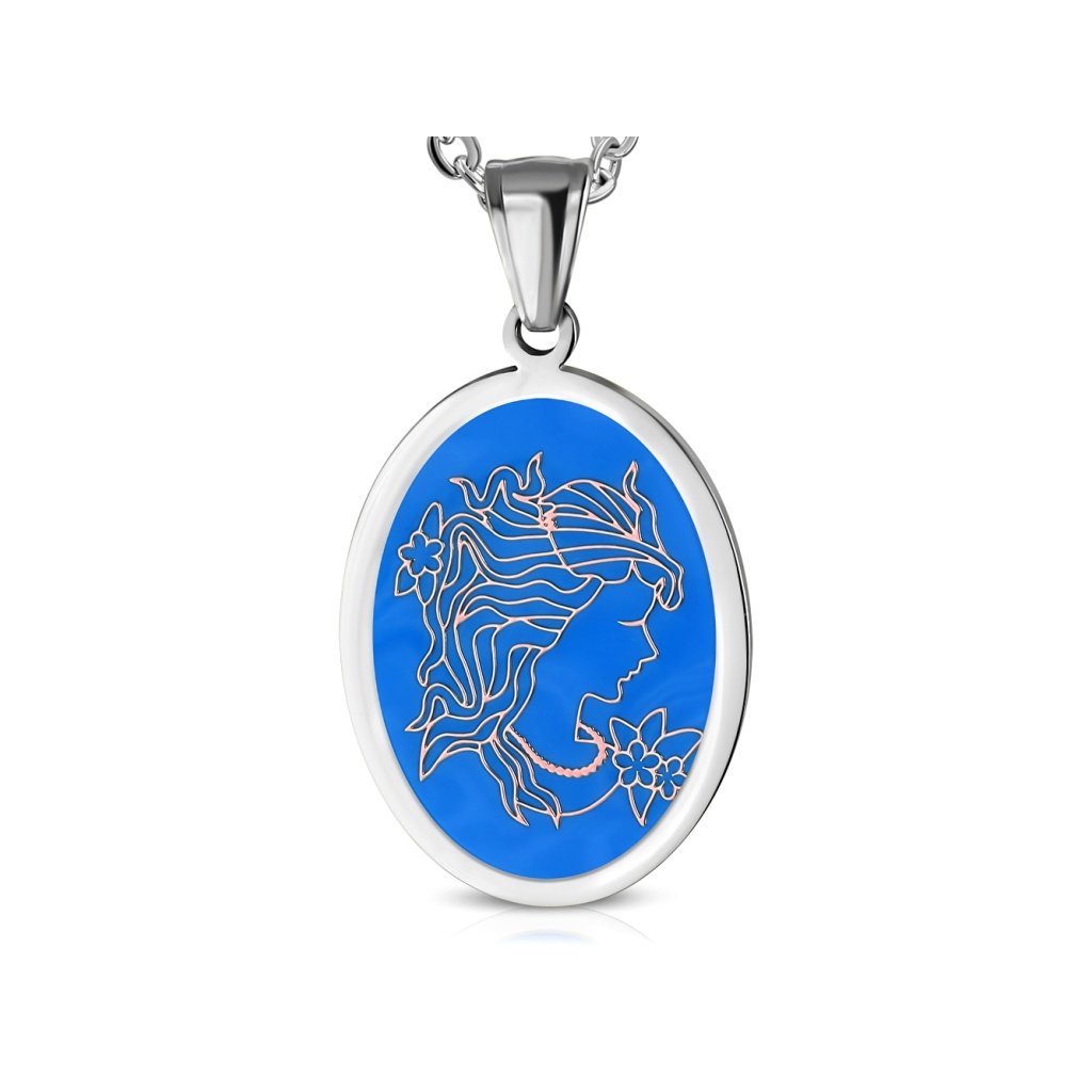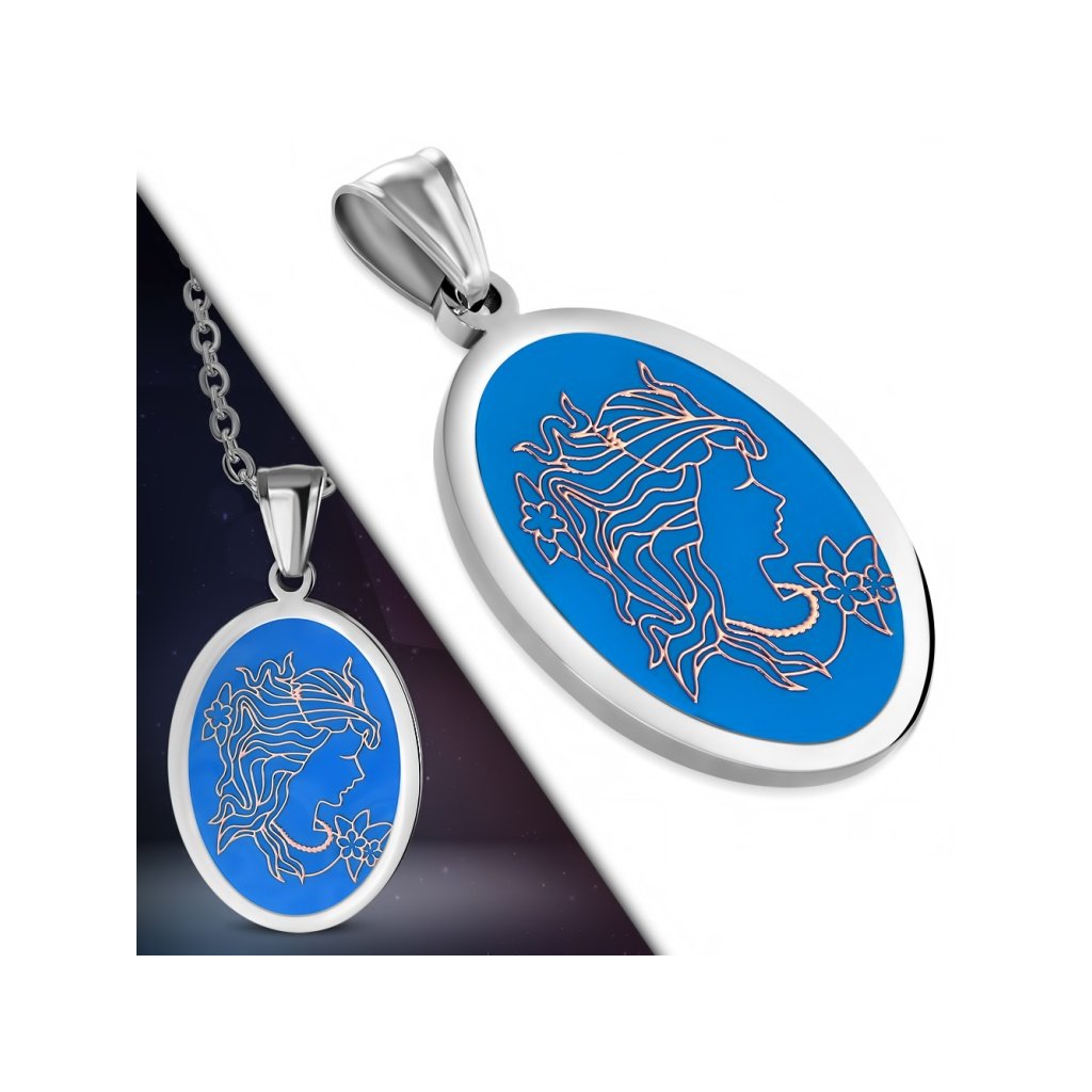 Krásna dámska retiazka s príveskom vyrobená z chirurgickej ocele. Prívesok má oválny tvar, kde na modrom pozadí je zobrazená hlava ženy - znamenie zverokruhu Panna. Prívesok je tak vhodný pre ženy narodené od 23.8. do 22.9. Ľudia v tomto znamení sú učenliví, racionálni a stále nohami na zemi. Ochotne pomôžu iným. Materiál retiazky aj prívesku je kvalitná chirurgická oceľ, ktorá je pevná a odolná. Nestráca svoj lesk, pretože nekoroduje a nečerná. Nevyžaduje si žiadnu špeciálnu starostlivosť a je vhodná na bežné každodenné nosenie, pretože je antialergická. Ak Vám nevyhovuje dĺžky retiazky, pri tomto produkte si zvoliť Vami požadovanú dĺžku.