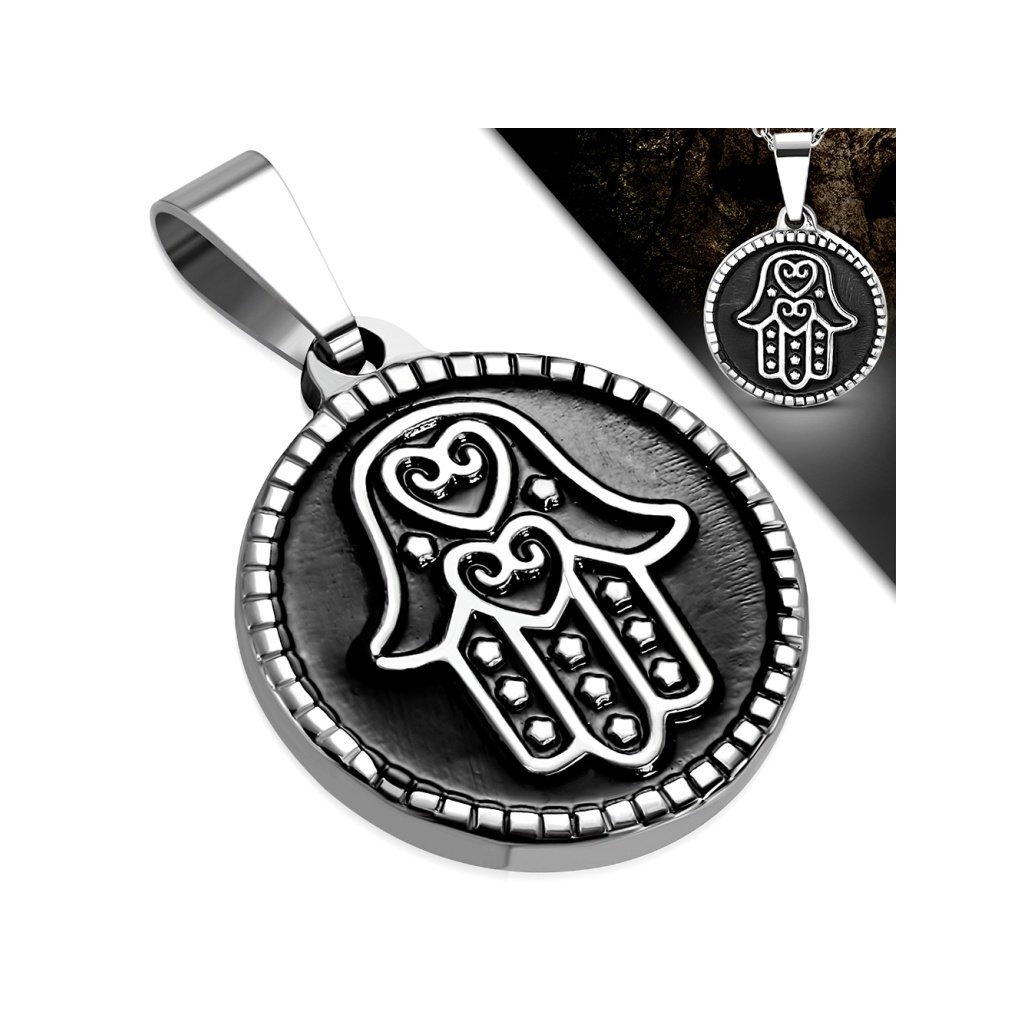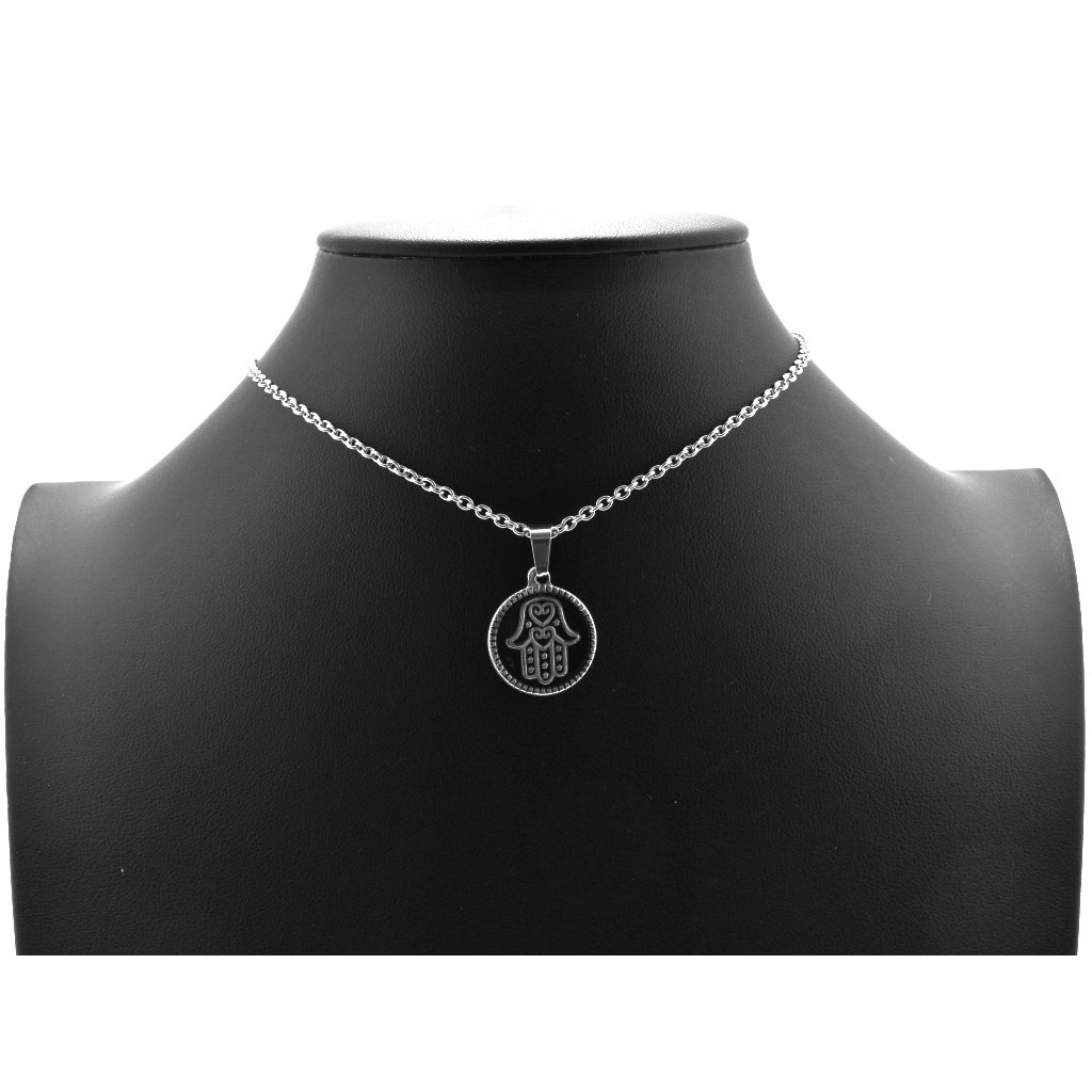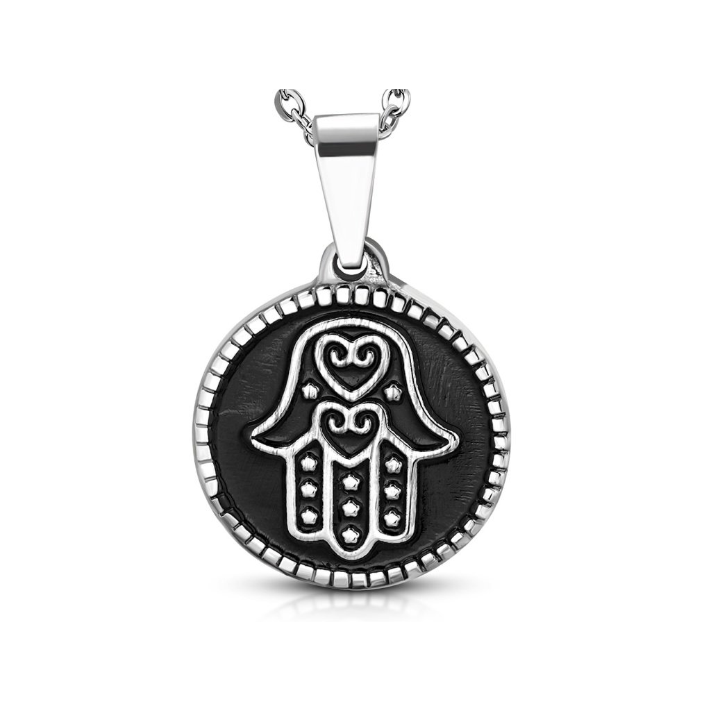 Dámska retiazka s príveskom z chirurgickej ocele v striebornom prevedení. Prívesok je okrúhly a na čiernom pozadí je zobrazená Fatimina ruka. Tá sa nazýva aj Hamsa. Tento symbol znázorňujem ženskosť a ochraňuje tehotné ženy. Je považovaný aj za talizman šťastia pre ženy. Retiazka aj prívesok sú vyrobené z chirurgickej ocele. Tento materiál si nevyžaduje žiadnu špeciálnu starostlivosť, a aj napriek tomu si uchováva svoj lesk. Oceľové šperky sú hypoalergénne a vhodné na bežné každodenné nosenie. Ak Vám nevyhovuje dĺžky retiazky, pri tomto produkte si zvoliť Vami požadovanú dĺžku.