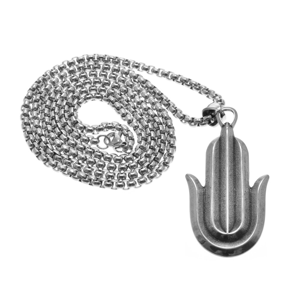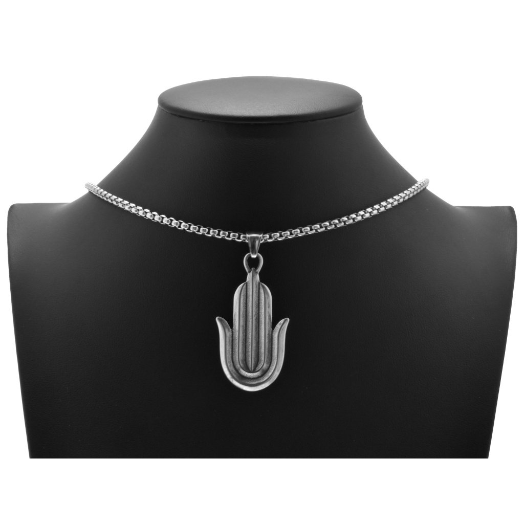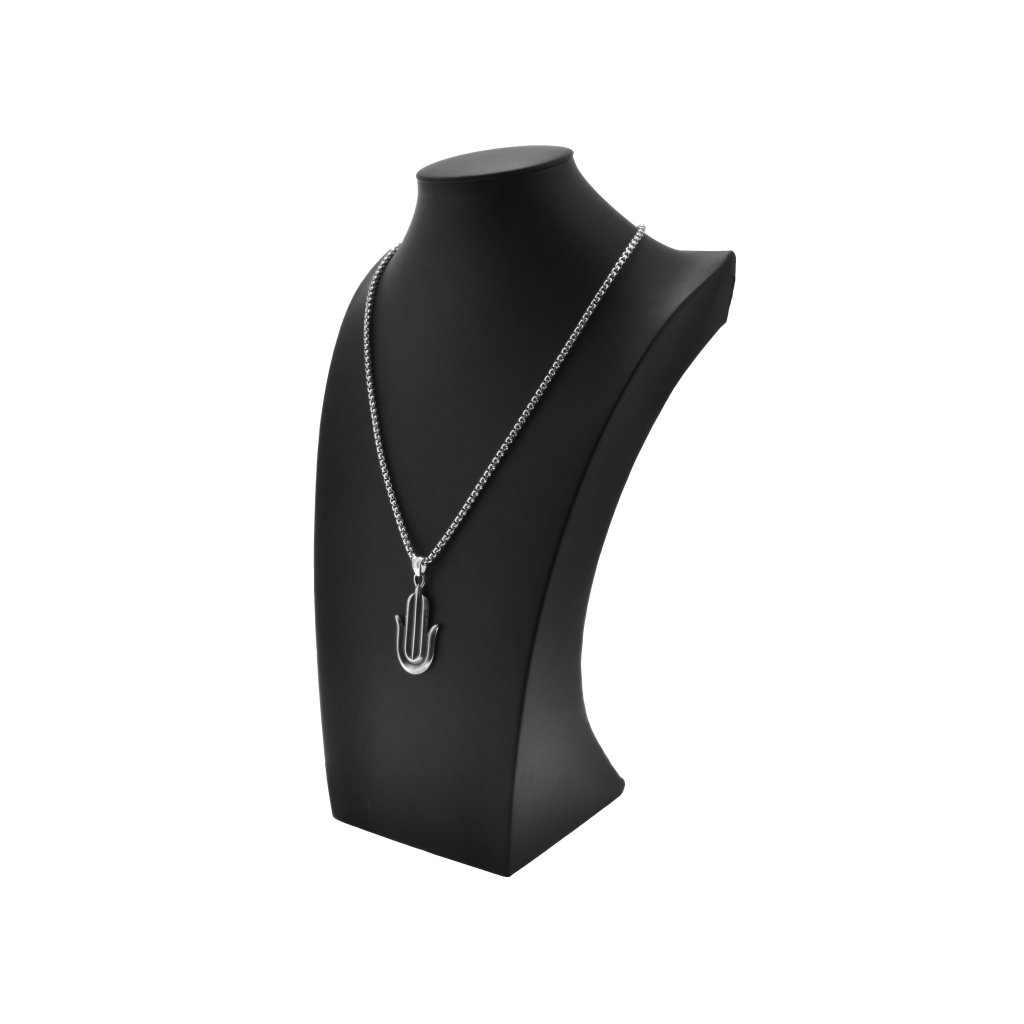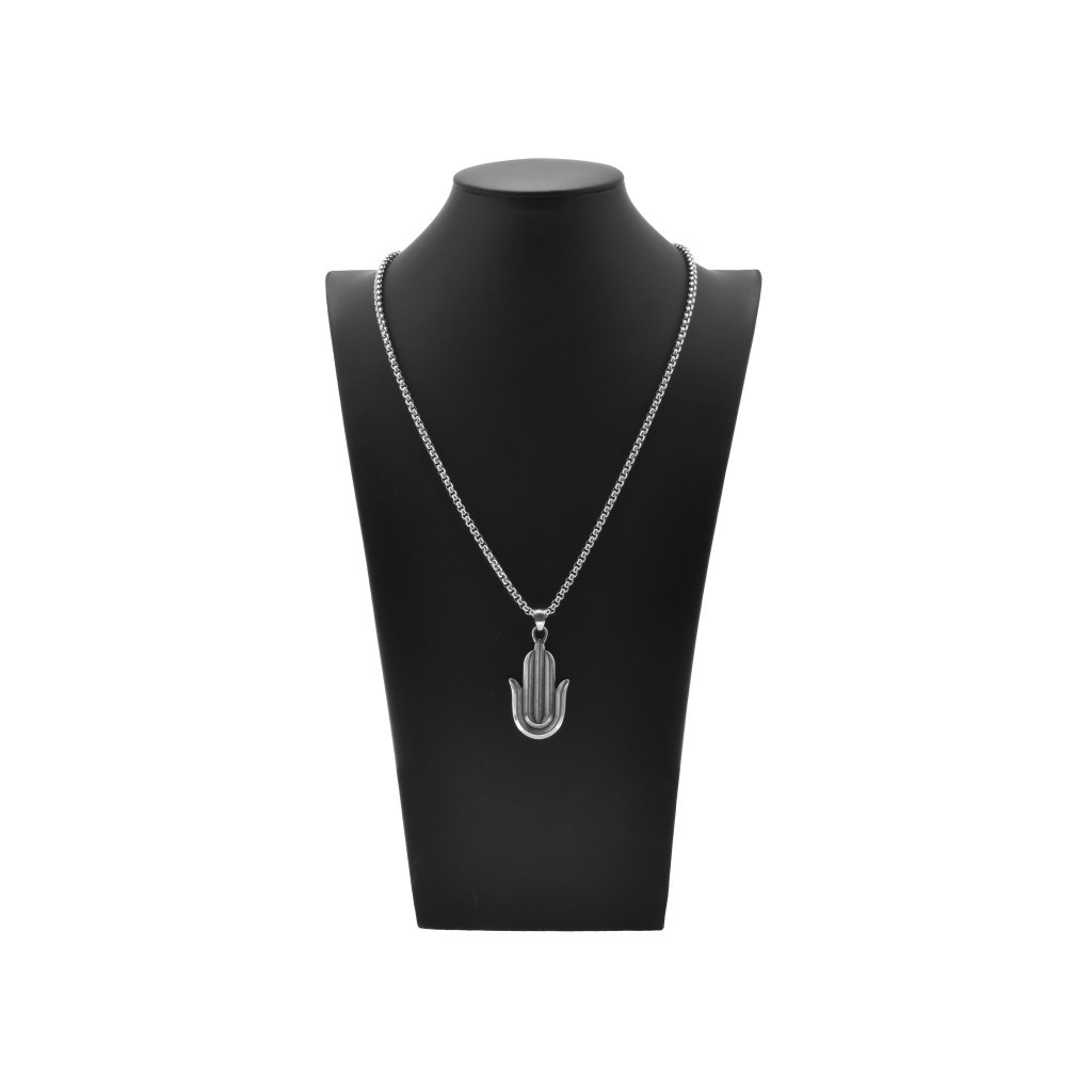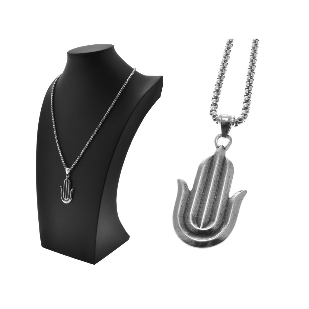 Dámska retiazka so zaujímavým príveskom vyrobená z chirurgickej ocele v striebornom prevedení. Tvar prívesku je ruka Fatiminy ktorá je nazývaná aj Hamsa. Tá predstavuje prvok islamského a židovského náboženstva. Tento symbol znázorňujem ženskosť a ochraňuje tehotné ženy. Je považovaný aj za talizman šťastia pre ženy. Retiazka má obľúbený vzor Box. Materiál retiazky aj prívesku je kvalitná chirurgickí oceľ, ktorá je odolná, nekoroduje a nečerná. Výhodou ocele je, že nepotrebuje žiadnu špeciálnu starostlivosť, je hypoalergénna a vhodná na bežné každodenné nosenie.