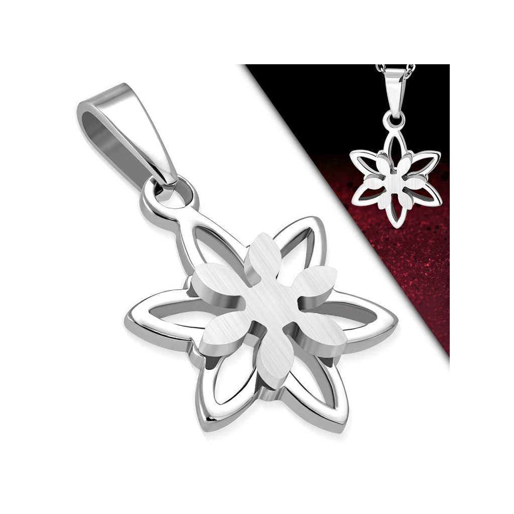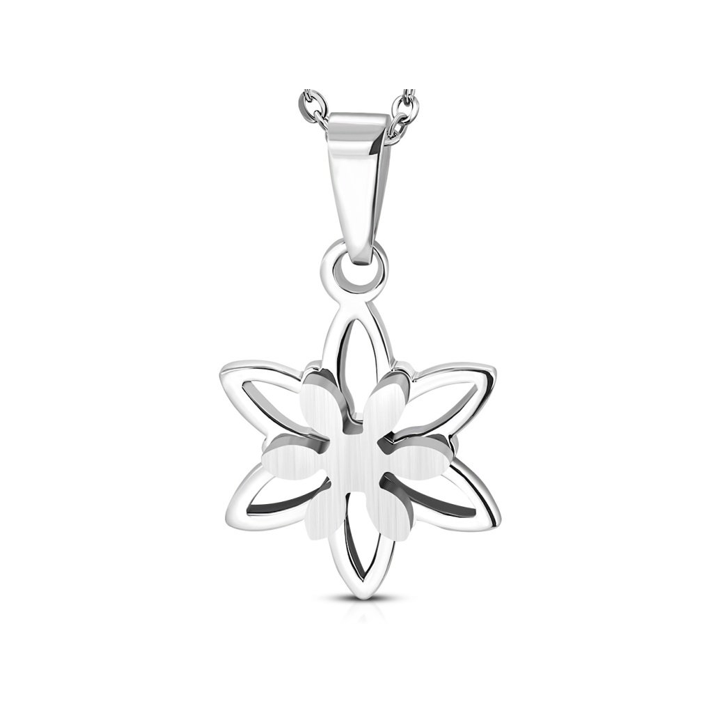 Krásny prívesok a retiazka z chirurgickej ocele v striebornej farbe. Prívesok sa skladá z kvetinky, na ktorej je ešte jedna menšia plného tvaru, čo vytvára celkovo krásny dojem. Prívesok pôsobí jemne a sviežo a je vhodný pre všetky vekové kategórie. Materiál retiazky a prívesku je kvalitná chirurgická oceľ, ktorá je veľmi odolná a pevná. Nestráca svoj, pretože nekoroduje a nečerná. Je vhodná na každodenné nosenie, pretože je hypoalergénna a nespôsobuje žiadne alergické reakcie. Ak Vám nevyhovuje dĺžky retiazky, pri tomto produkte si zvoliť Vami požadovanú dĺžku.