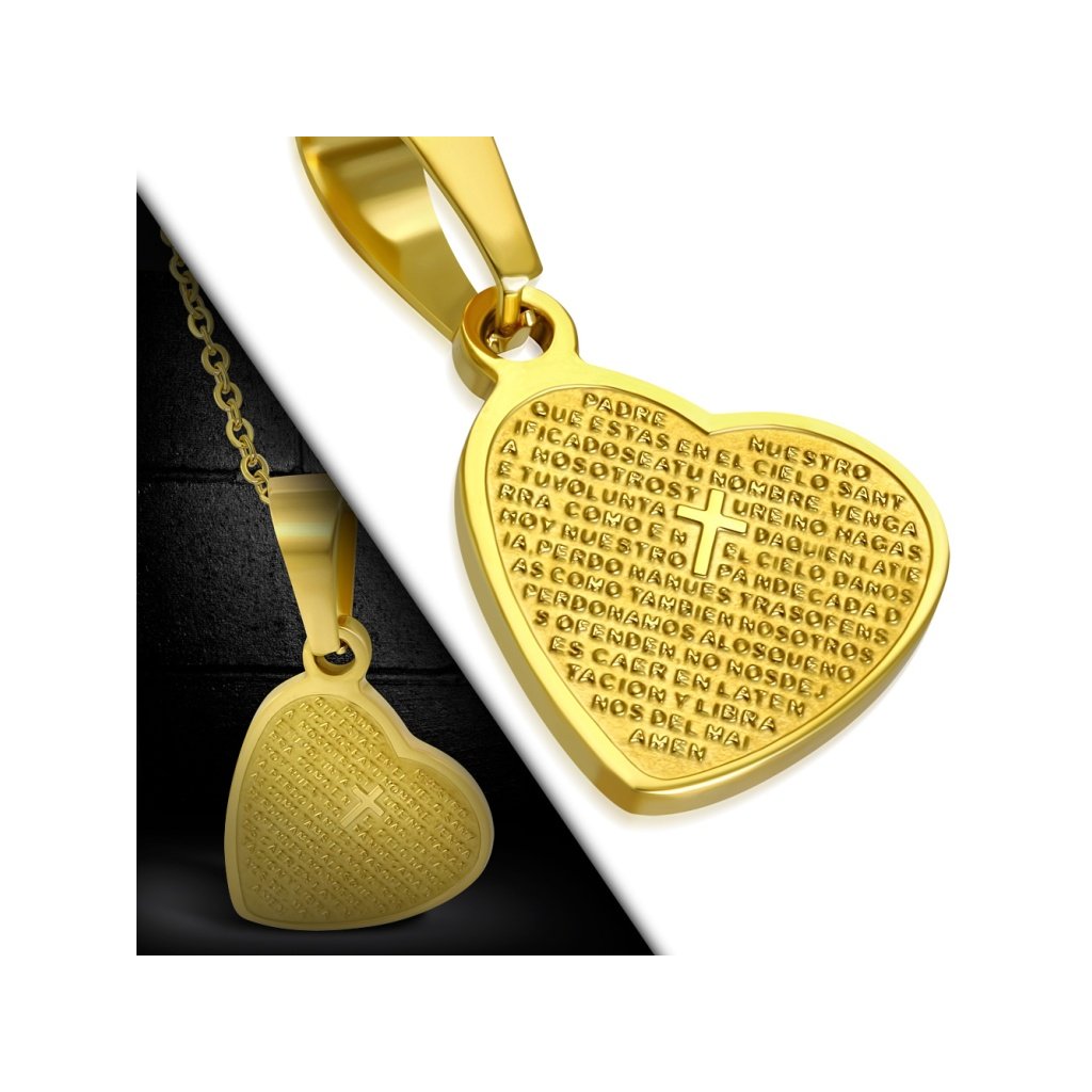 Krásny dámsky prívesok vyrobený z chirurgickej ocele v zlatej farbe. Prívesok má tvar srdca, na ktorom je vygravírovaný kríž a modlitba v španielskom jazyku. Srdiečko je menšie, pôsobí jemne a decentne a je to šperk, ktorý má náboženský význam. Hodí sa aj ako darček k cirkevným udalostiam človeka. Materiál retiazky aj prívesku je kvalitná chirurgická oceľ. Je to pevný a odolný materiál, ktorý je navyše aj antialergický. Chirurgickú oceľ môžete nosiť každý deň a nevyžaduje si žiadnu špeciálnu starostlivosť. Pri tomto šperku máte možnosť si vybrať vlastnú dĺžku retiazky ak Vám nevyhovuje jej základná dĺžka.