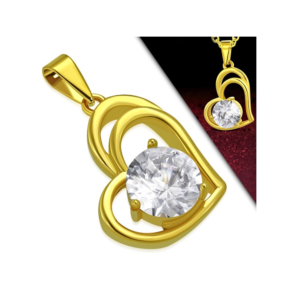 Dámska retiazka s príveskom srdce z chirurgickej ocele v zlatej farbe. Prívesok je v tvare srdiečka, vnútri ktorého je väčšie očko čírej farby. Prívesok pôsobí veľmi nežne a romanticky. Výborne sa dá zladiť s náušnicami alebo s náramkom. Materiál prívesku aj retiazky je chirurgická oceľ, ktorá je antialergická, čo je veľmi dôležitý faktor pri výbere šperkov. Oceľ si nevyžaduje žiadnu špeciálnu starostlivosť. Pri tomto produkte si viete vybrať dĺžku retiazky ak Vám nevyhovuje jej základná dĺžka.