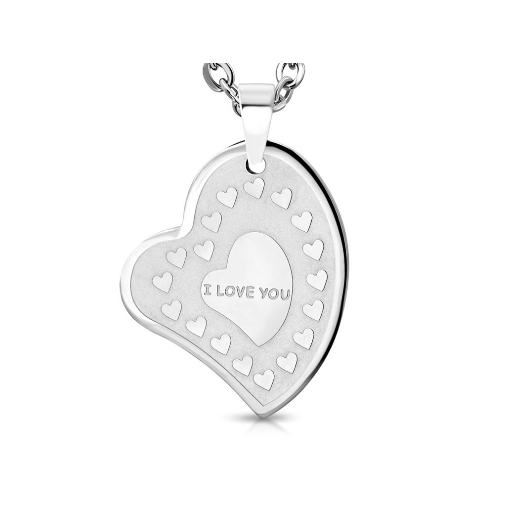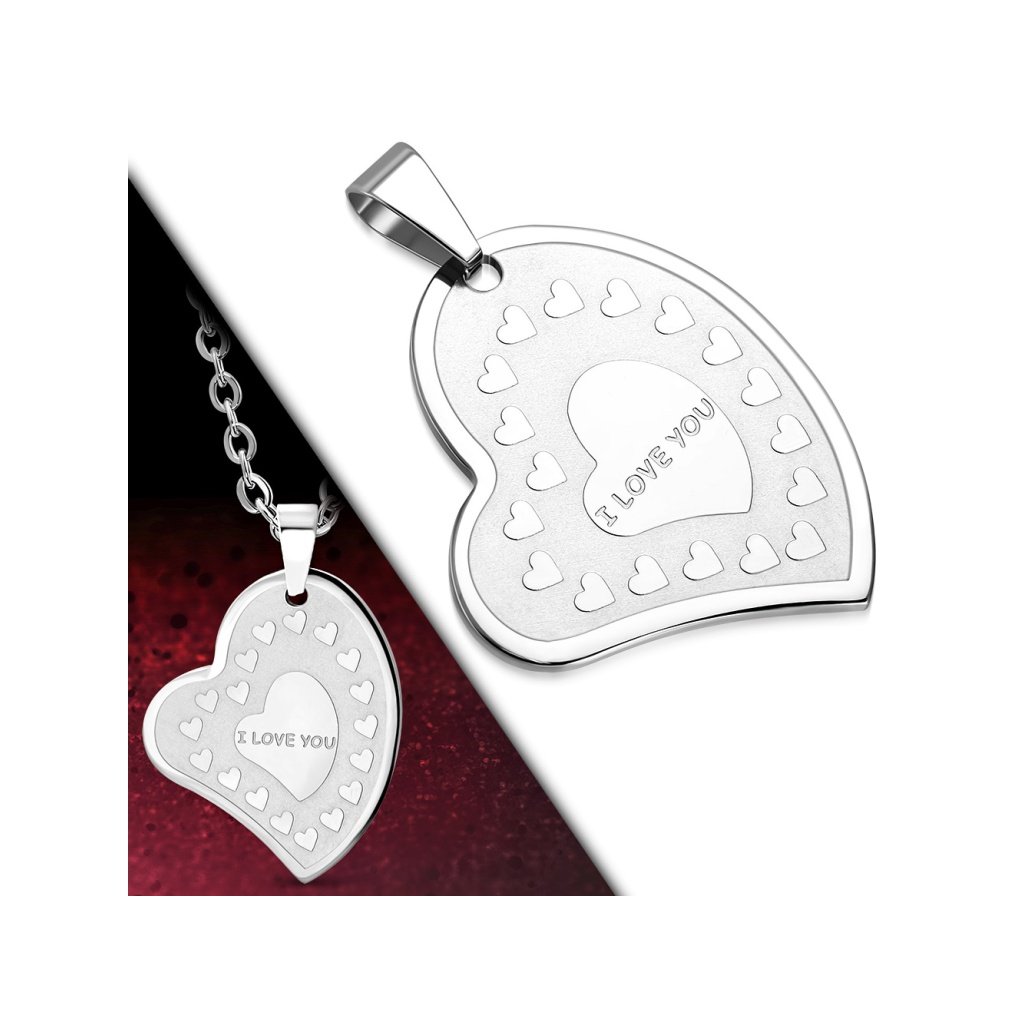 Nádherný prívesok srdce vyrobený z chirurgickej ocele. Prívesok má tvar asymetrického srdca, ktoré má matné pozadie. Na ňom sú malé lesklé srdiečka a jedno veľké s nápisom I Love You - Milujem Ťa. Prívesok je skvelý ako romantický darček na vyjadrenie lásky. Je vhodný skôr pre mladšie dámy. Celý šperk, retiazka aj prívesok, je vyrobený z kvalitnej nehrdzavejúcej ocele. Tá si nevyžaduje žiadnu špeciálnu starostlivosť, je pevná a odolná a vhodná na bežné každodenné nosenie. Chirurgická oceľ je antialergická. Pri tomto šperku si viete zvoliť dĺžku retiazky podľa vlastnej potreby.