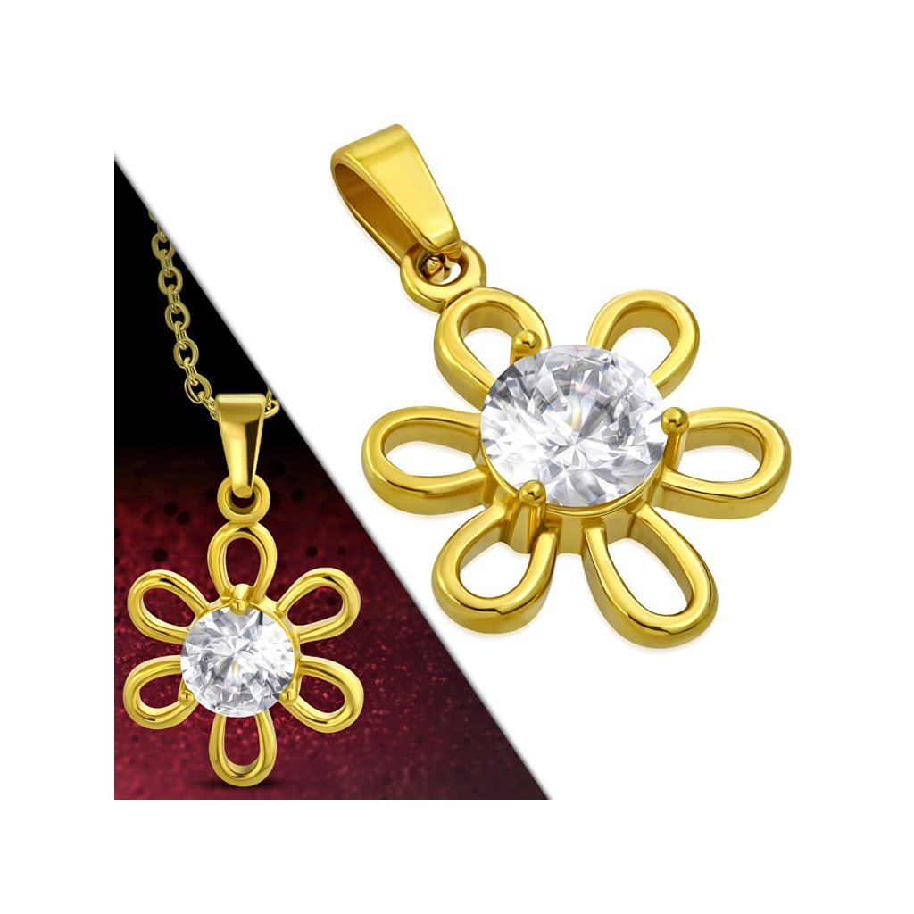 Krásny prívesok kvet z chirurgickej ocele v zlatom prevedení. Prívesok je v tvare kvetinky, v strede ktorej je očko čírej farby. Prívesok pôsobí sviežo a nežne a je vhodný pre všetky vekové kategórie žien. Výborne sa dá zladiť s inými doplnkami zlatej farby. Dlhú živostnosť šperku zaručuje chirurgická oceľ, z ktorej sú prívesok aj retiazka vyrobené. Je antialergická a nepotrebuje žiadnu špeciálnu starostlivosť. Pri tomto produkte si môžete zvoliť Vami požadovanú dĺžku retiazky.
