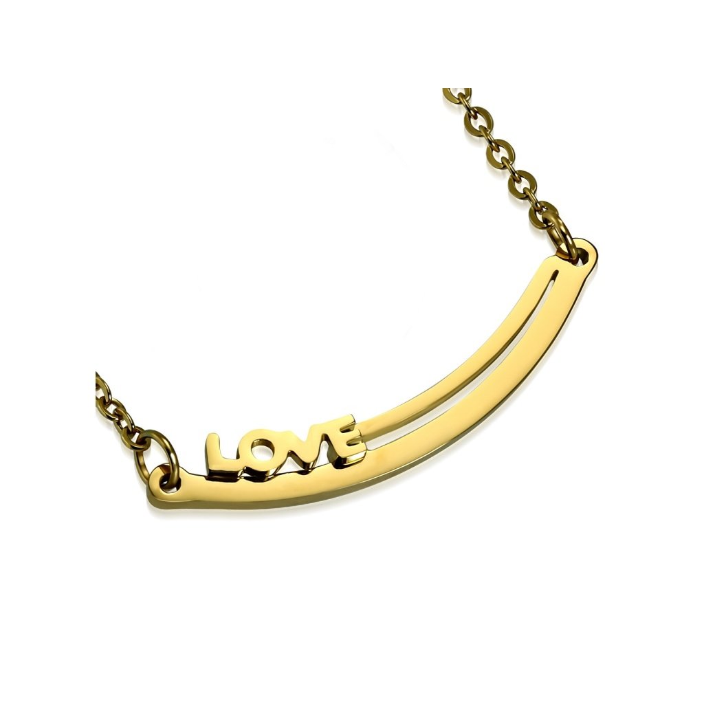 Krásny dámsky šperk retiazka s príveskom vyrobená z chirurgickej ocele. Šperk je v zlatom farebnom prevedení. Dominantou jemnej retiazky je ozdoba v tvare jemného polkruhu s nápisom LOVE. Retiazka s príveskom pôsobí nežne a romanticky, je tak vhodná pre dámy, ktoré preferujú jemnejší štýl šperkov. Výborne sa dá zladiť s náušnicami, náramkom, či prsteňom. Materiál retiazky s príveskom je kvalitná chirurgická oceľ, ktorá je veľmi populárna. Šperky z chirurgickej ocele sú antialergické a vhodné na bežné každodenné nosenie.
