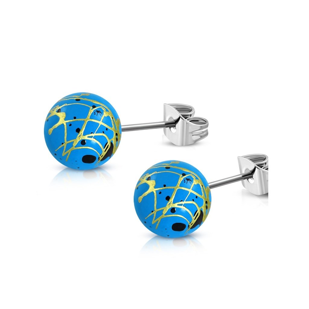 Dámske náušnice vyrobené z akrylu a chirurgickej ocele. Náušnice majú guličkový tvar veľký 8 mm. Sú modrej farby a zdobené zlatou a čiernou farbou, ktorá vyzerá ako pofŕkaná štetcom. Preto každá z náušníc má svoj jedinečný vzor. Náušnice sú vhodné pre dámy v každom veku a ľahko sa dajú skombinovať s inými šperkami. Zapínanie náušníc je puzetového typu a vyrobené z kvalitnej chirurgickej ocele. Tá je antialergická, preto náušnice môžete nosiť bez obáv každý deň.