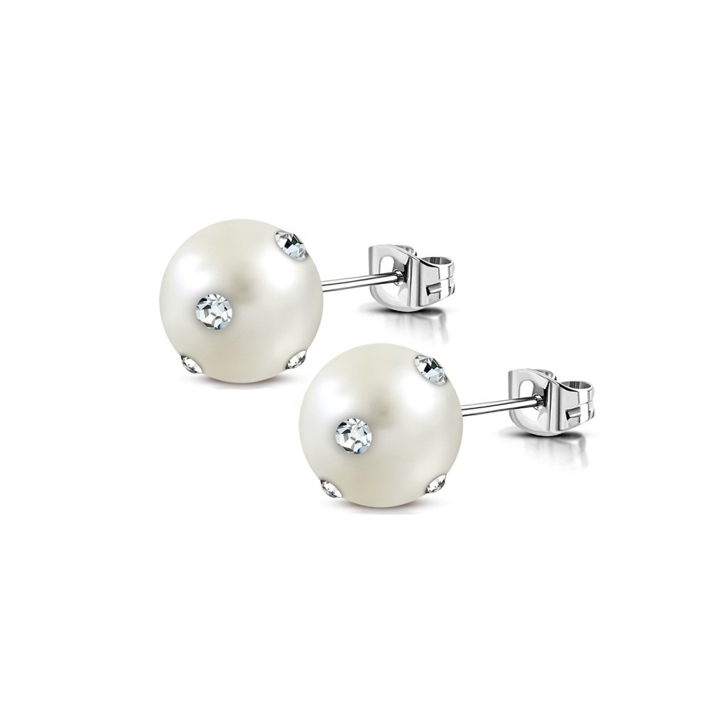 Krásne perličkové náušnice z chirurgickej ocele. Náušnice sú svetlej krémovej farby s čírymi očkami. Je to klasika, ktorá skvele doplní elegantnejší outfit, ale aj voľnočasový, keďže perličkové náušnice nie sú len slávnostné.Výborne sa dajú skombinovať napríklad s náramkom alebo náhrdelníkom. Zapínanie náušníc je puzetového typu a je vyrobené z kvalitnej chirurgickej ocele, ktorá je antialergická a vhodná na bežné každodenné nosenie.