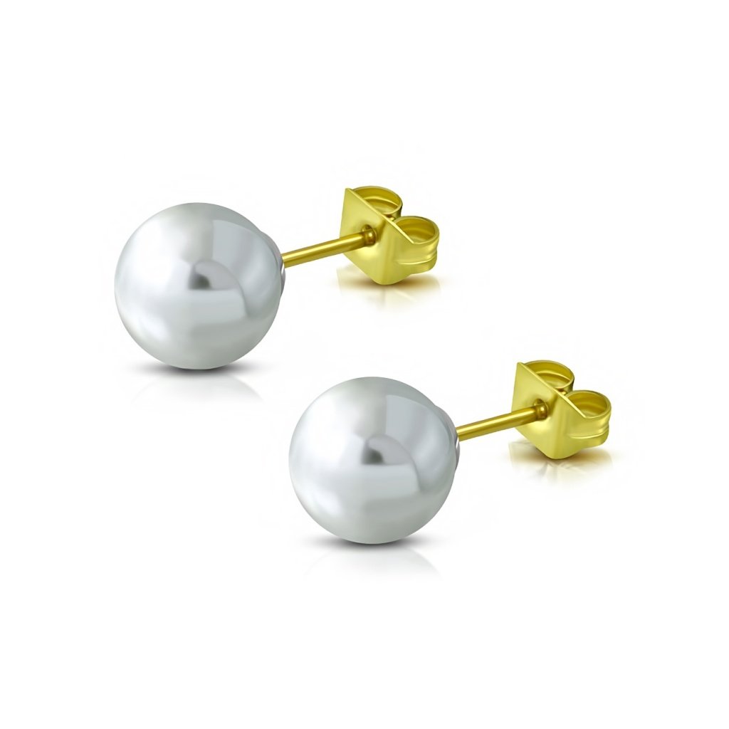 Krásne dámske náušnice z chirurgickej ocele. Náušnice perličky majú bielu farbu, pričom kovové časti vyrobené z chirurgickej ocele sú v zlatej farbe. Táto farbená kombinácia vytvára krásny celok a perličkové náušnice sú klasika, ktorá nikdy nezostarne. Ľahko ich zladíte s inými doplnkami. Pri chirurgickej oceli sa nemusíte báť alergických reakcií, pretože je hypoalergénna a vhodná na bežné každodenné nosenie. Zapínanie náušníc je puzetového typu. Pri týchto náušniciach si môžete vybrať až zo štyroch veľkostí 6 mm, 7 mm, 8 mm alebo 10 mm.