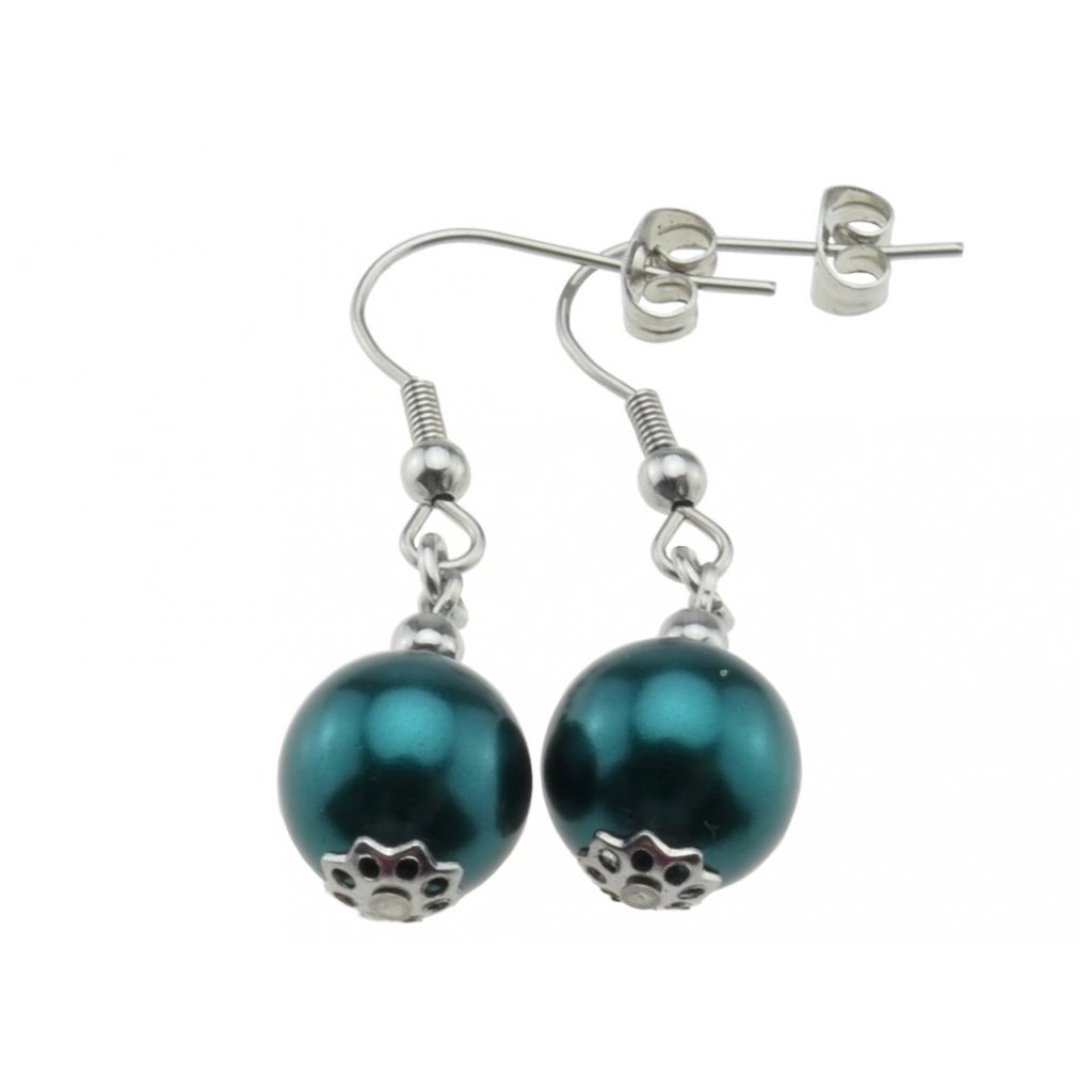 Jednoduché, no pekné dámske náušnice. Visiace náušnice majú korálku v tmavozelenej farbe, ktorá je zospodu zdobená kaplíkom, v tvare kvetinky. Náušnice majú obľúbený africký háčik, vďaka ktorému je manipulácia s náušnicami jednoduchá. Materiál náušníc je kvalitná chirurgická oceľ, ktorá nečerná ani nekoroduje, a preto je vhodná na bežné každodenné nosenie.