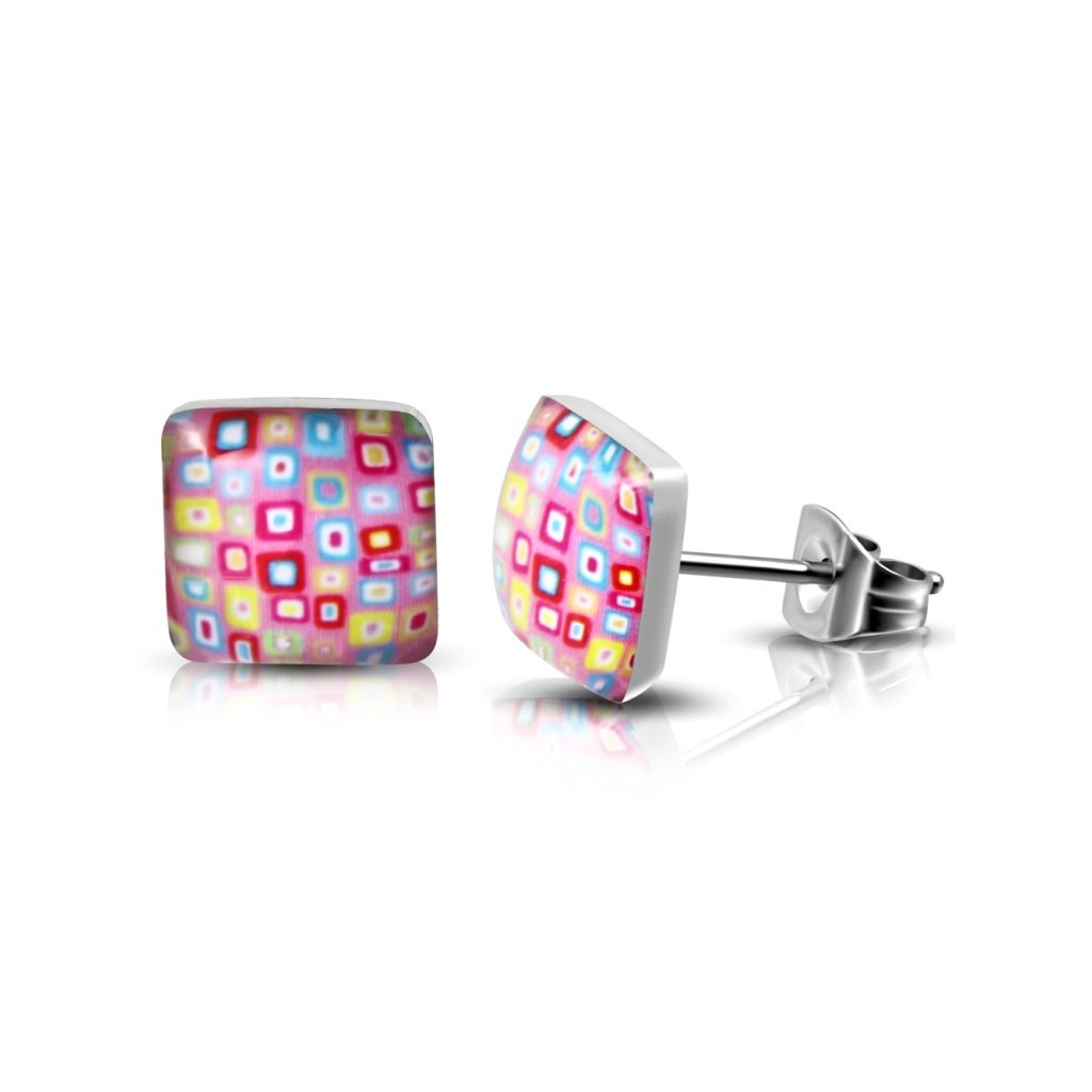 Pekné dámske náušnice z chirurgickej ocele. Náušnice majú štvorcový tvar, ktorý má na ružovom pozadí malé farebné štvorčeky. Pôsobia sviežo a mladistvo, a preto sú vhodné aj pre malé parádnice. Ľahko ich doplníte nejakým farebným príveskom. Kovové časti sú vyrobené z kvalitnej chirurgickej ocele, ktorá nečerná a nekoroduje. Je to pevný a odolný materiál, ktorý nepotrebuje žiadnu špeciálnu starostlivosť. Náušnice sú vhodné na bežné každodenné nosenie. Zapínanie majú puzetového typu.