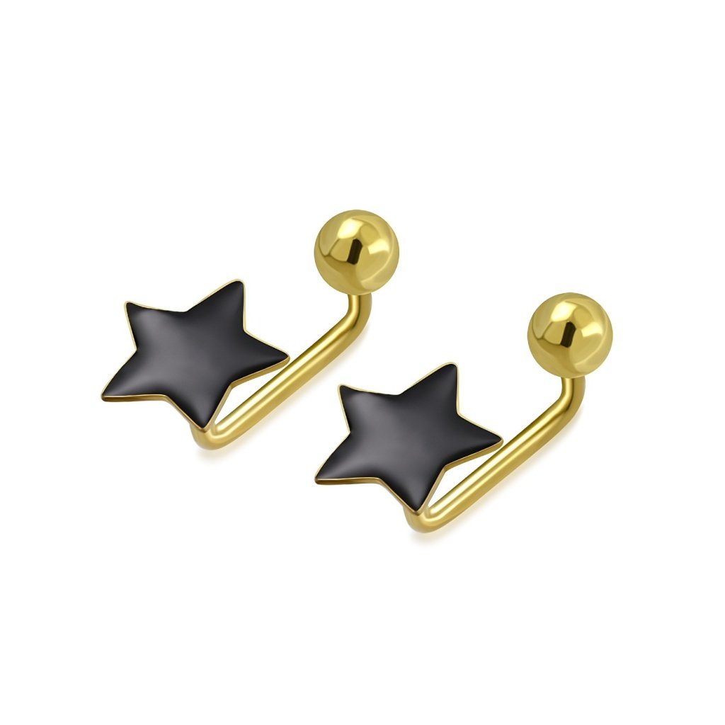 Krásne dámske náušnice vyrobené z chirurgickej ocele. Náušnice sú v zlatom prevedení a s hviezdičkou v čiernej farbe. Zaujímavosťou týchto náušníc je, že sa nasadzujú zozadu ucha a gulička tak slúži na zašrubovanie náušnice. Veľmi ľahký spôsob nosenia náušníc, ktorý z nich spraví výnimočný šperk. Náušnice hravo zladíte s rôznymi retiazkami, príveskami alebo náramkami. Materiál náušníc je kvalitná chirurgická oceľ, ktorá si nevyžaduje žiadnu špeciálnu starostlivosť, je pevná a odolná. Náušnice si tak udržia svoj tvar a farbu. Navyše oceľové šperky sú antialergické, čo je jedno veľké plus pri ich výbere.