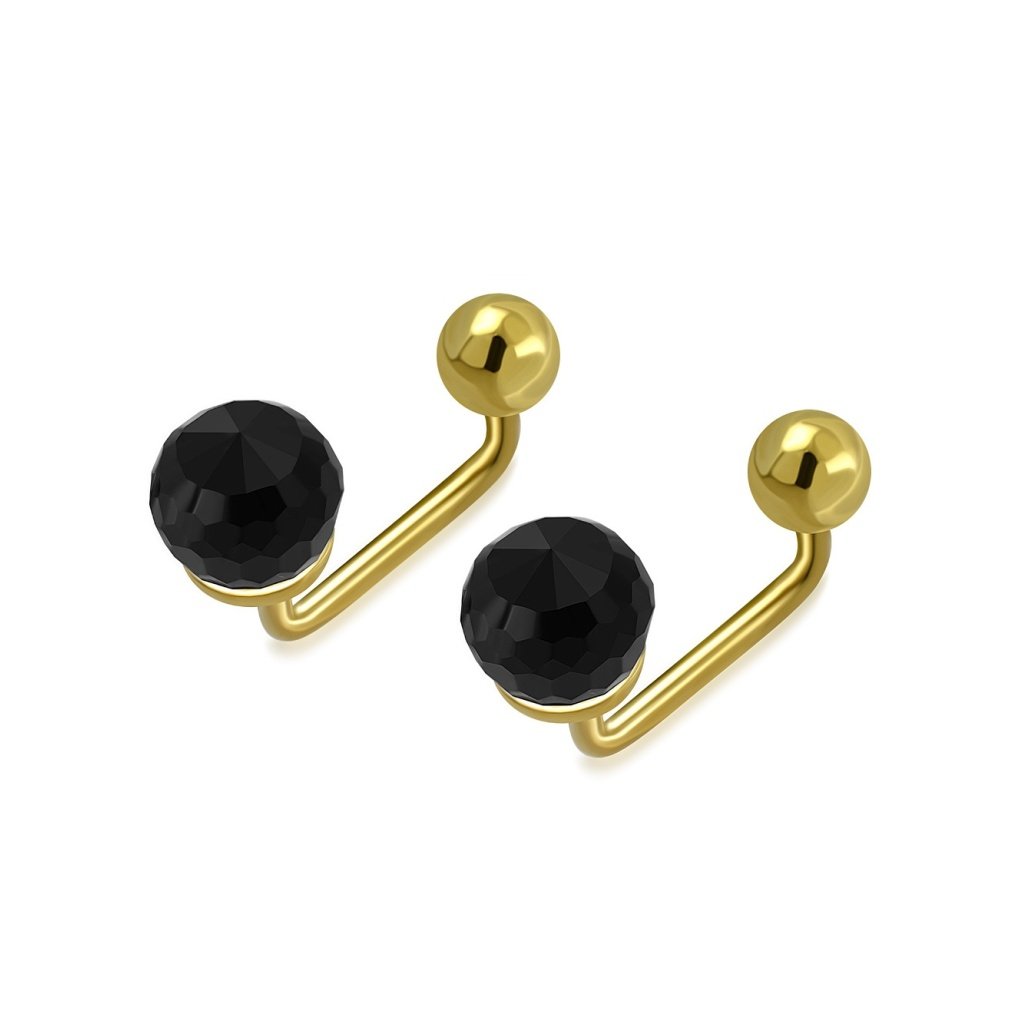 Krásne dámske náušnice vyrobené z chirurgickej ocele. Náušnice sú v zlatom prevedení a s čiernou guličkou s fazetovým výbrusom. Zaujímavosťou týchto náušníc je, že sa nasadzujú zozadu ucha a zlatá gulička tak slúži na zašrubovanie náušnice. Veľmi ľahký spôsob nosenia náušníc, ktorý z nich spraví výnimočný šperk. Náušnice hravo zladíte s rôznymi retiazkami, príveskami alebo náramkami. Materiál náušníc je kvalitná chirurgická oceľ, ktorá si nevyžaduje žiadnu špeciálnu starostlivosť, je pevná a odolná. Náušnice si tak udržia svoj tvar a farbu. Navyše oceľové šperky sú antialergické, čo je jedno veľké plus pri ich výbere.