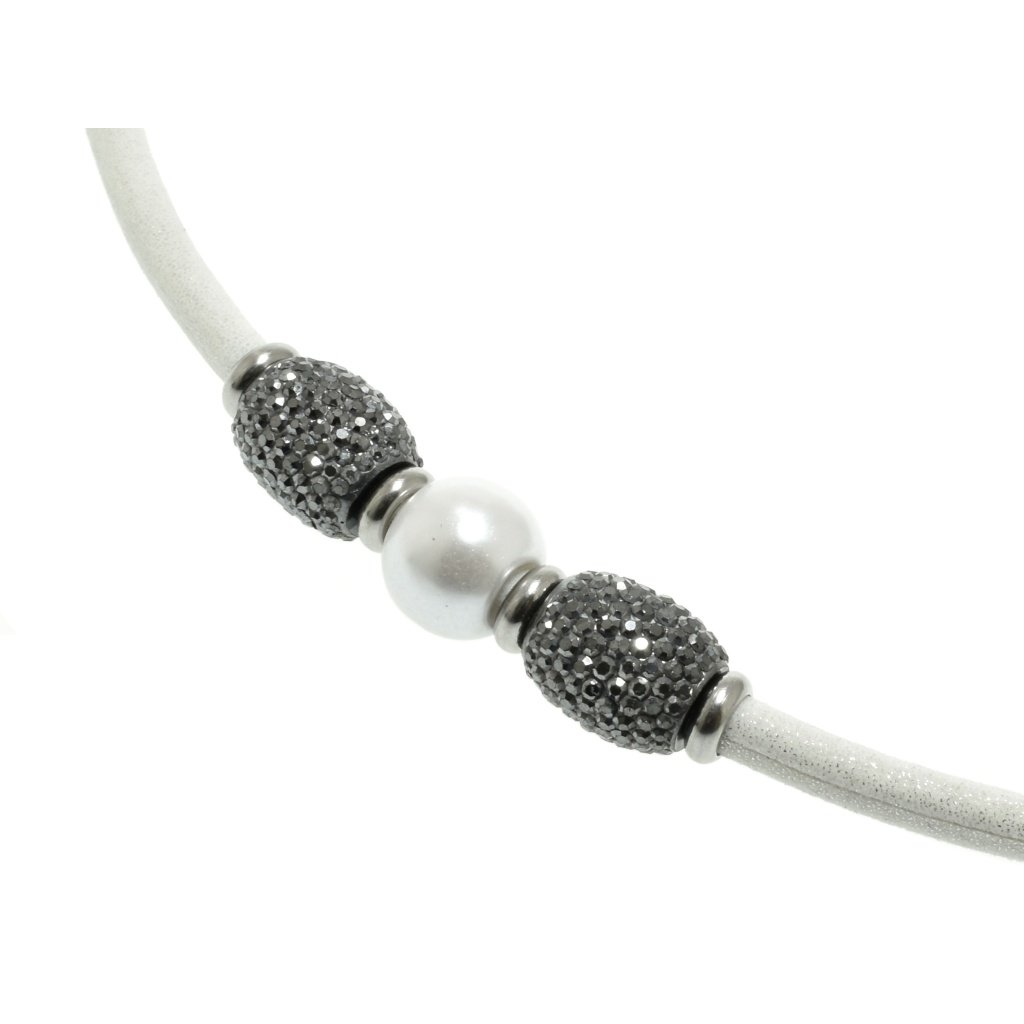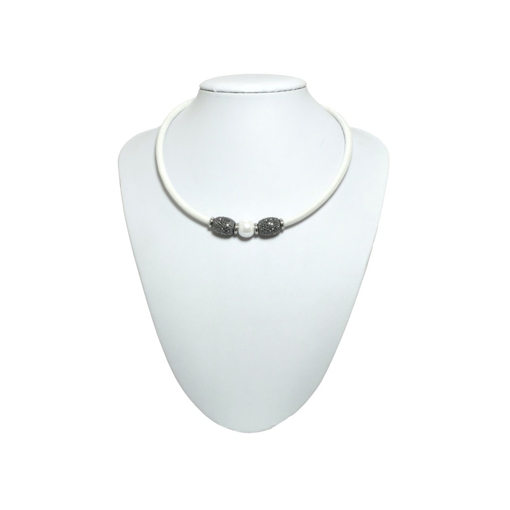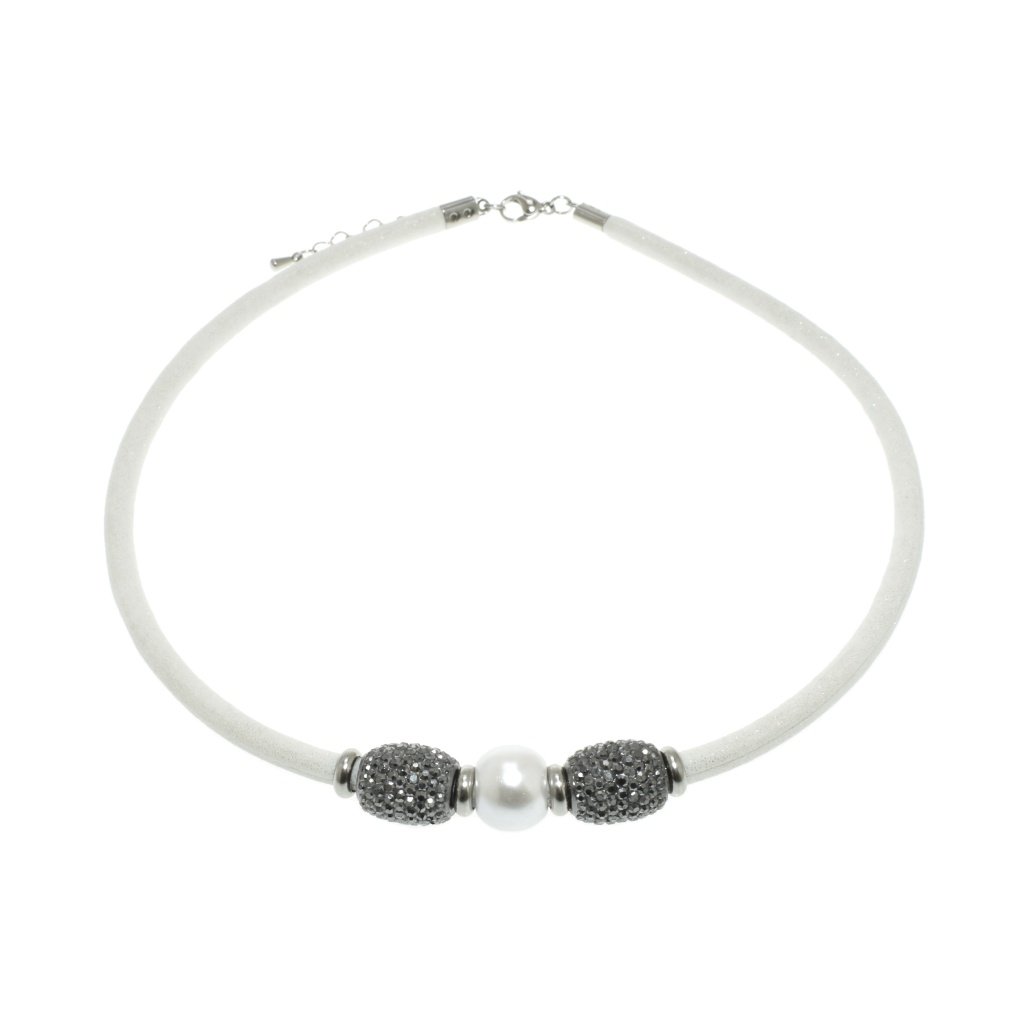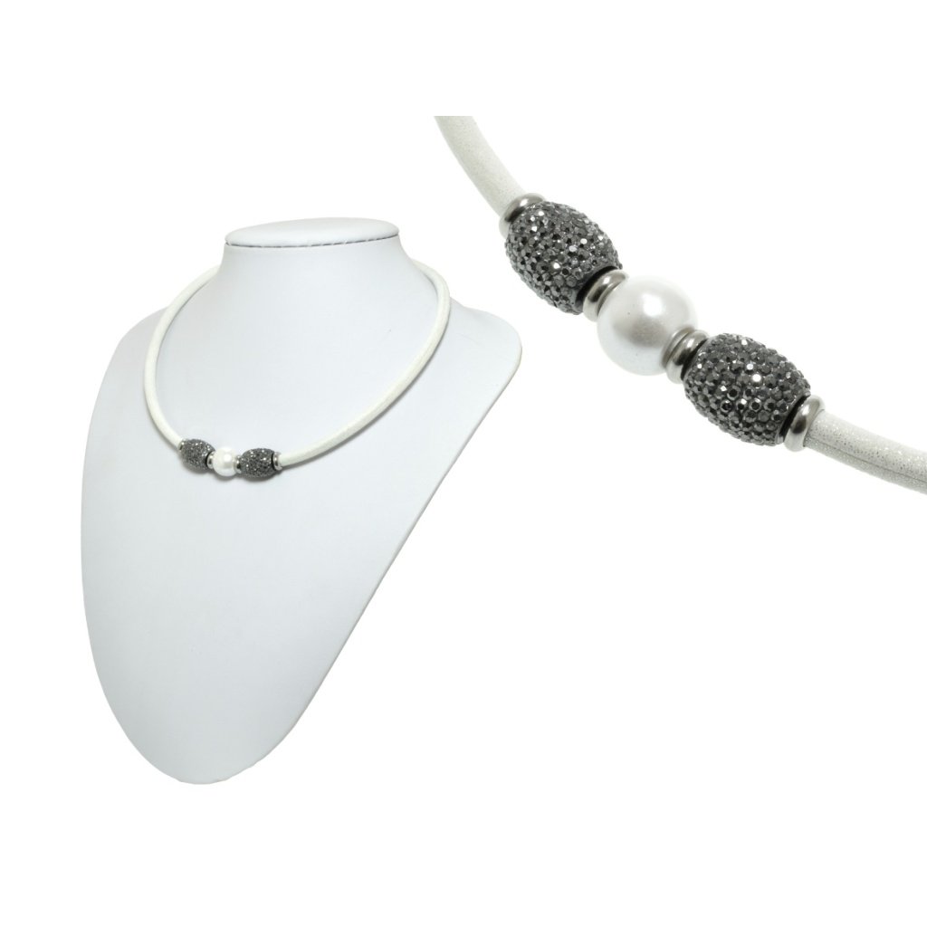 Dámsky náhrdelník "fashion" vyrobený z textilnej šnúry a chirurgickej ocele. Zaujímavý dámsky šperk, ktorý očari každého. Na hrubej textilnej šnúre bielej farby s trblietkami sú navlečené ozdoby v podobe jednej bielej perly a čierne guličky zdobené malými očkami. Medzi nimi sú menšie oceľové krúžky. Náhrdelník ma zapínanie na klasickú karabínku s predlžovacou retiazkou 5 cm. Tento šperk je vhodný na spoločenské udalosti, ale aj na kávu do mesta s priateľmi. Náhrdelníkom osviežite každý svoj outfit a ľahko sa skombinujte s inými šperkami.