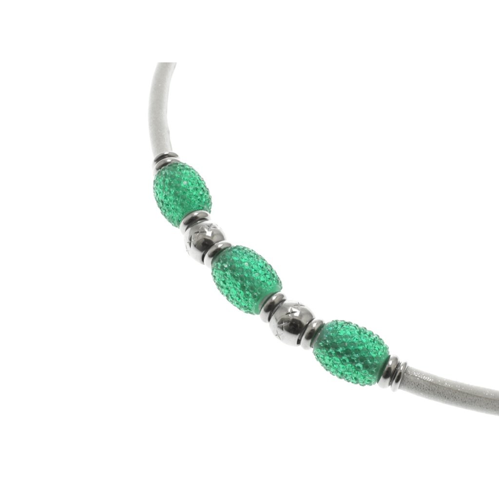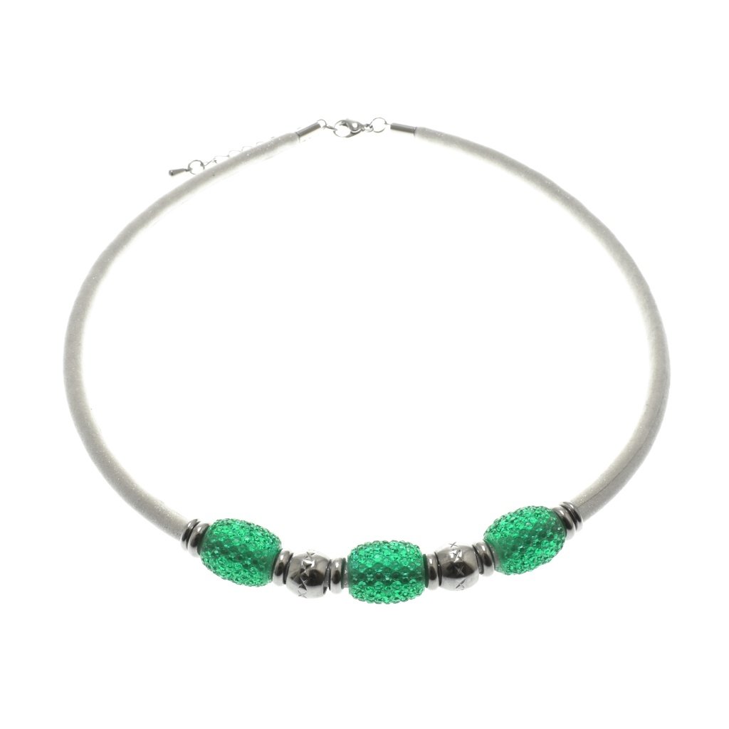 Krásny "fashion" náhrdelník z textilnej šnúry a chirurgickej ocele. Zaujímavý náhrdelník vhodný pre všetky dámy, či už na kávu do mesta, alebo k slávnostnejšiemu outfitu. Náhrdelník je vyrobený z hrubej textilnej šnúry, na ktorej sú navlčené ozdobné brúsené korálky v zelenej farbe a korálky z chirurgickej ocele. Zapínanie šperku je taktiež vyrobené z nehrdzavejúcej ocele, ktorá zaručí Vášmu šperku dlhú živostnosť. Zapínanie disponuje predlženou retiazkou 4 cm, vďaka ktorej si komfortne viete nastaviť dĺžku náhrdelníku.