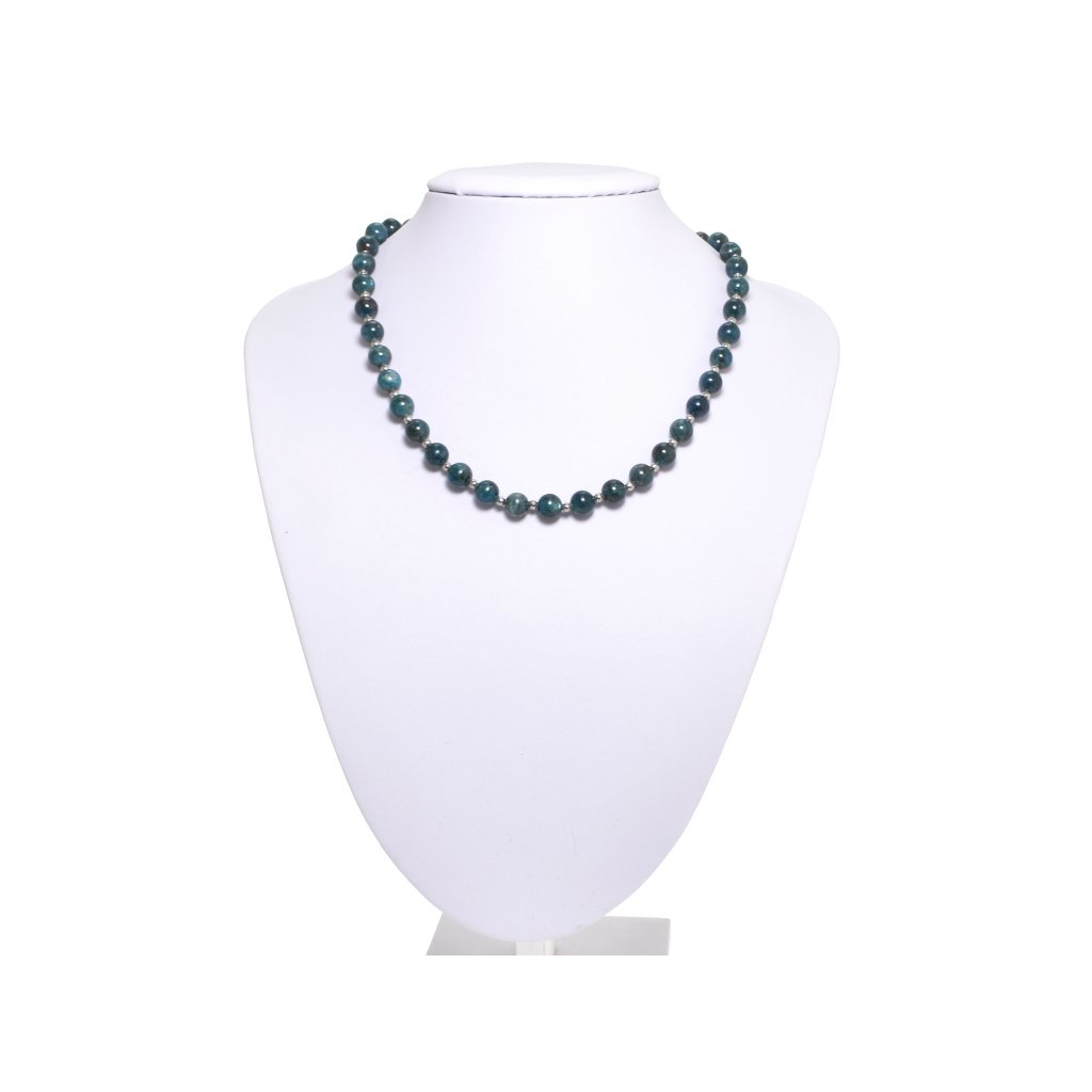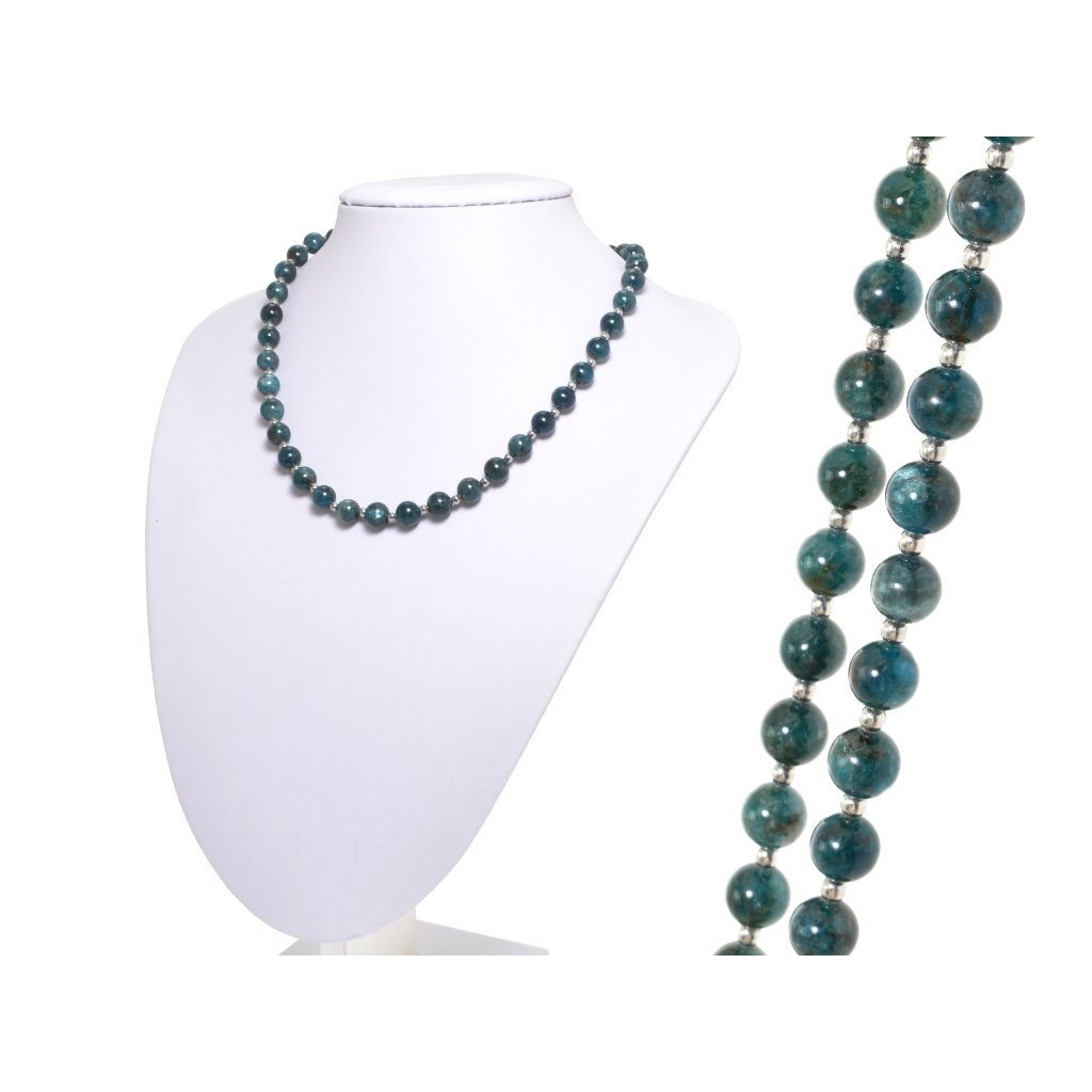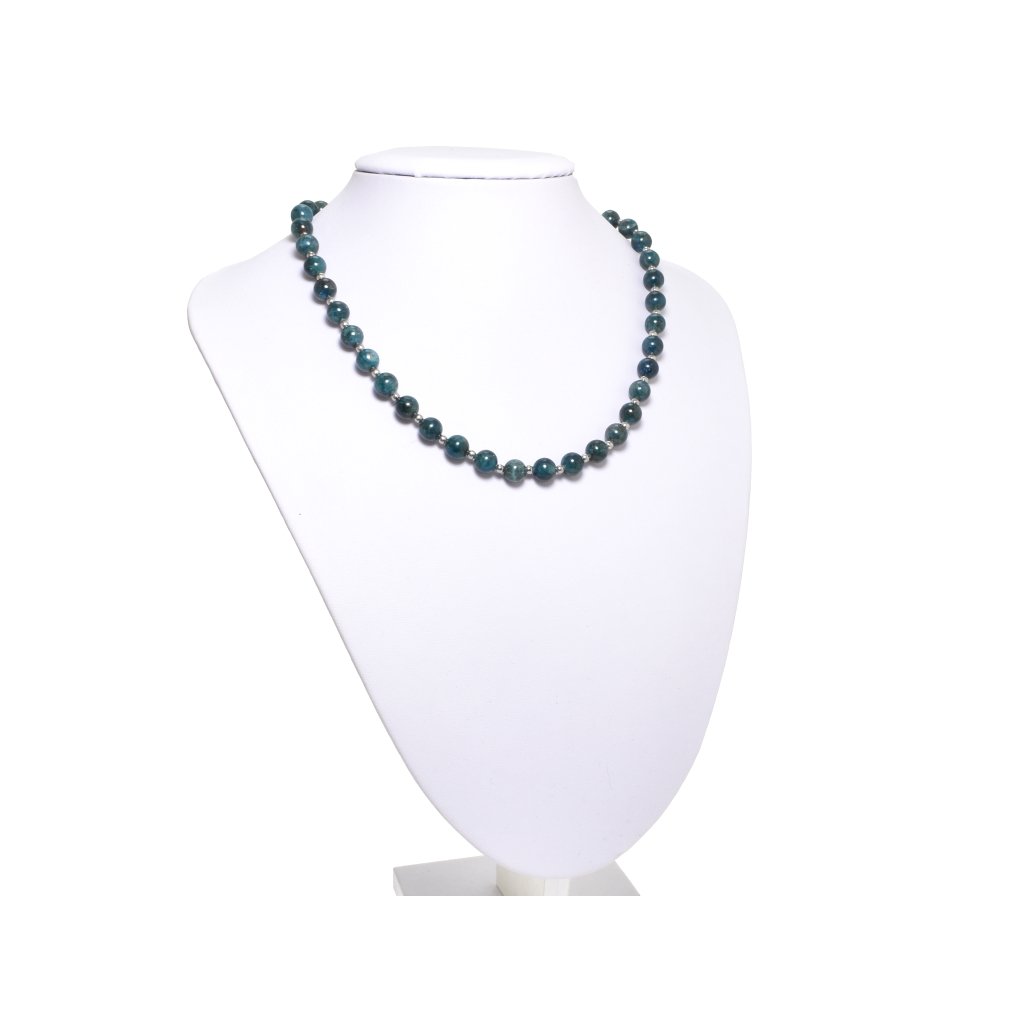 Dámsky náhrdelník z polodrahokamu Apatit v kombinácii s chirurgickou oceľou. Polodrahokam Apatit je známy svojou schopnosťou odstraňovať zlú energiu, tlmiť zlosť a apatiu. Prináša radosť a pôsobí ako života budič. Práve kvôli rôznym schopnostiam polodrahokamov, sú šperky vyrábané z nich tak obľúbené. Apatit vyniká svojou zvláštnou modrozelenou farbou. Medzi korálkami z polodrahokamu sú malé guličky z chirurgickej ocele a navlečené sú na niti zo 100 % prírodného hodvábu. Zapínanie šperku je na klasickú karabínku s predlžovacou retiazkou, vďaka ktorej si dokážete prispôsobiť jeho dĺžku.