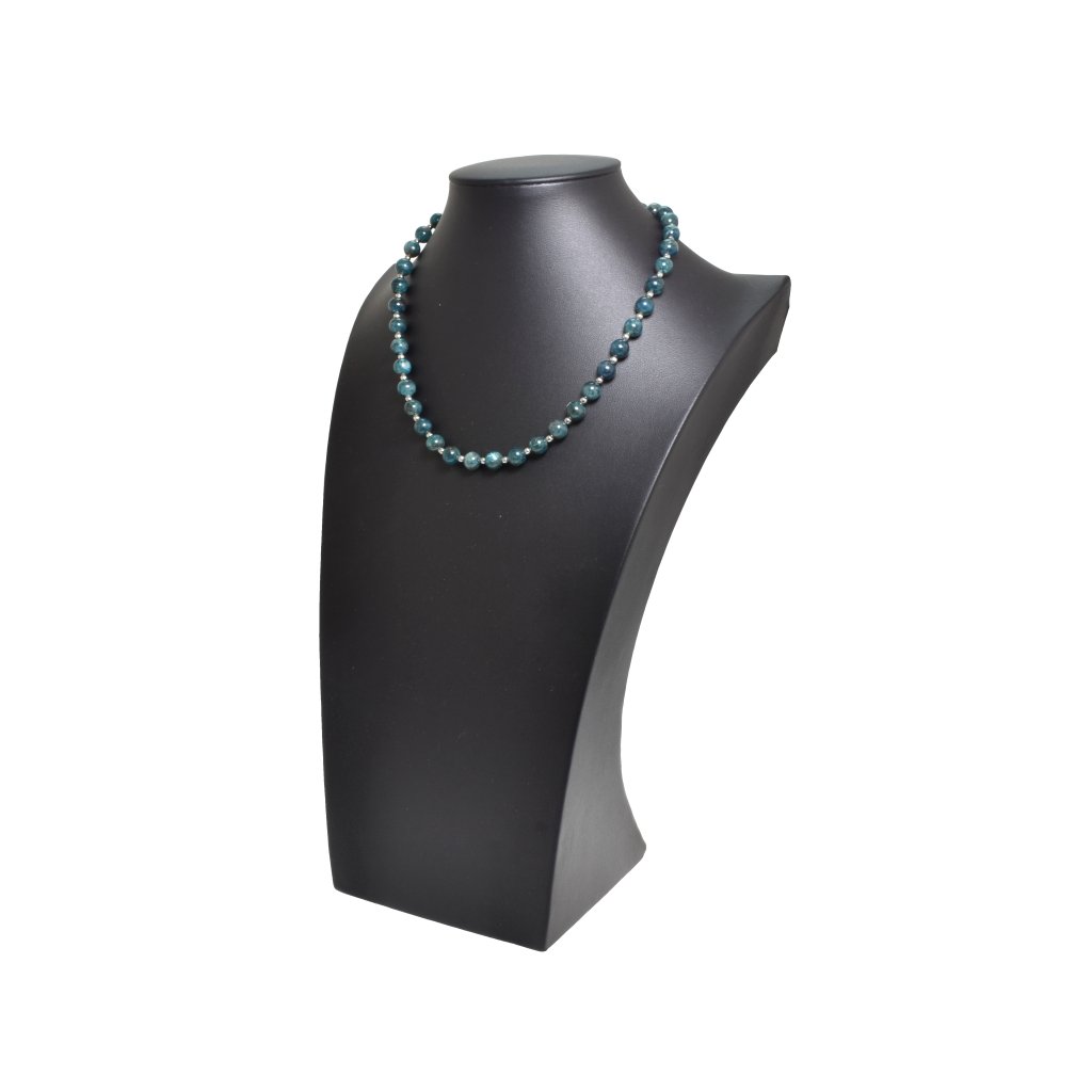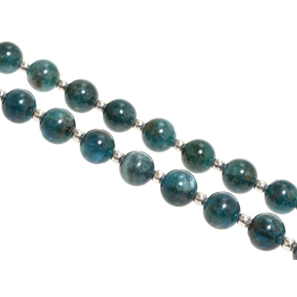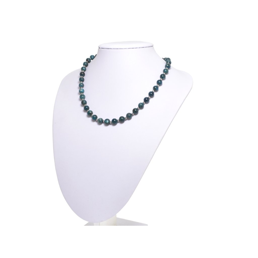 Dámsky náhrdelník z polodrahokamu Apatit v kombinácii s chirurgickou oceľou. Polodrahokam Apatit je známy svojou schopnosťou odstraňovať zlú energiu, tlmiť zlosť a apatiu. Prináša radosť a pôsobí ako života budič. Práve kvôli rôznym schopnostiam polodrahokamov, sú šperky vyrábané z nich tak obľúbené. Apatit vyniká svojou zvláštnou modrozelenou farbou. Medzi korálkami z polodrahokamu sú malé guličky z chirurgickej ocele a navlečené sú na niti zo 100 % prírodného hodvábu. Zapínanie šperku je na klasickú karabínku s predlžovacou retiazkou, vďaka ktorej si dokážete prispôsobiť jeho dĺžku.
