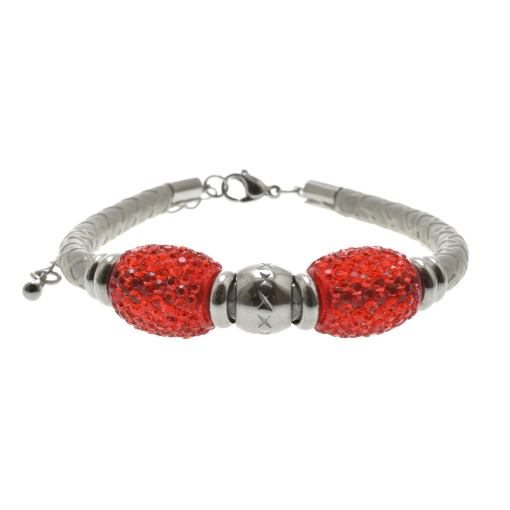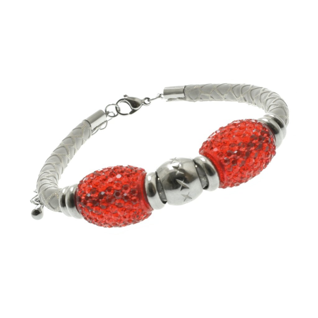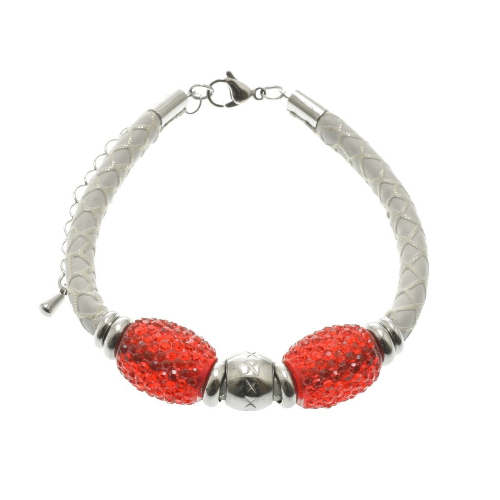 Fashion dámsky náramok z textilnej šnúry. Krásny náramok s nádhernými korálkami v jasnej červenej farbe, ktoré sú posiaté maličkými očkami, ktoré sa vo svetle ligocú. Korálky sú navlečené na hrubej textilnej šnúre bielej farby s jemným vzorom so striebornými bodkami. K náramku viete zladiť presne taký istý náhrdelník, s ktorým si vytvoríte skvelý set. Zapínanie je na klasickú karabínku a disponuje až 5 cm predĺženou retiazkou, vďaka ktorej si viete nastaviť potrebnú dĺžku náramku.