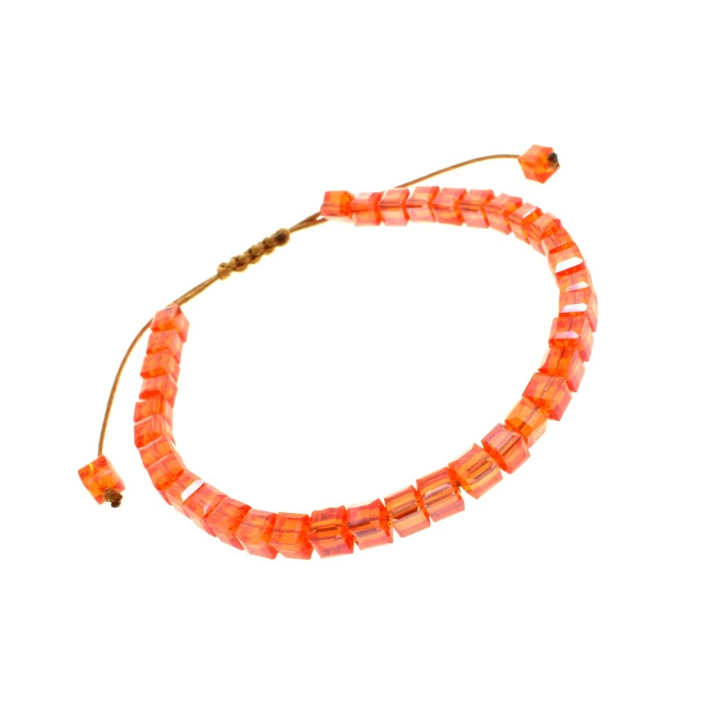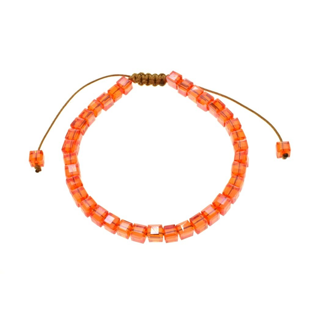 Zaujímavý dámsky náramok v krásnej oranžovej farbe s jemnými odleskmi. Náramok pozostáva z malých kociek navlečených na textilnej šnúre. Malé kocky sú vyrobená zo skla. Veľkosť náramku si viete pohodlne nastaviť vďaka textilnej šnúre. Náramok pôsobí hravo a skvelé sa hodí napríklad k letným outfitom. Veľmi ľahko ho doladíte s inými šperkami ako napríklad s náušnicami, príveskom alebo prsteňom.