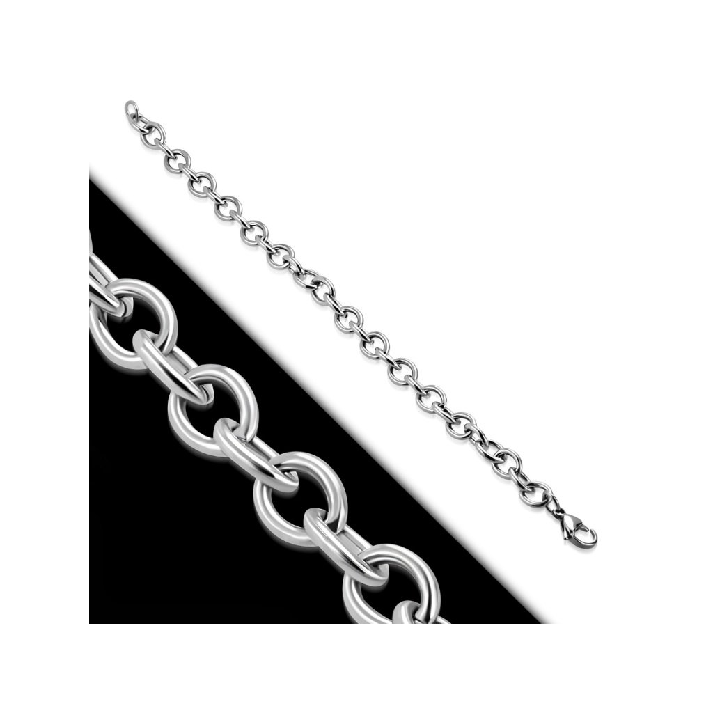 Dámsky náramok vyrobený z chirurgickej ocele v striebornej farbe. Náramok je pospájaných z väčších oválnych očiek, ktoré sú hladké. Pôsobí mohutnejšie, preto ho odporúčané kombinovať s jemnejšou retiazkou alebo príveskom. Ľahko k nim však skombinujete rôzne náušnice. Materiál šperku je kvalitná chirurgická oceľ, ktorá je hypoalergénna, čo býva veľmi rozhodujúci faktor pri výbere šperkov, keďže pri oceli sa nemusíte obávať žiadnej alergickej reakcie. Taktiež nekoroduje ani nečerná a udržiava si svoj lesk.
