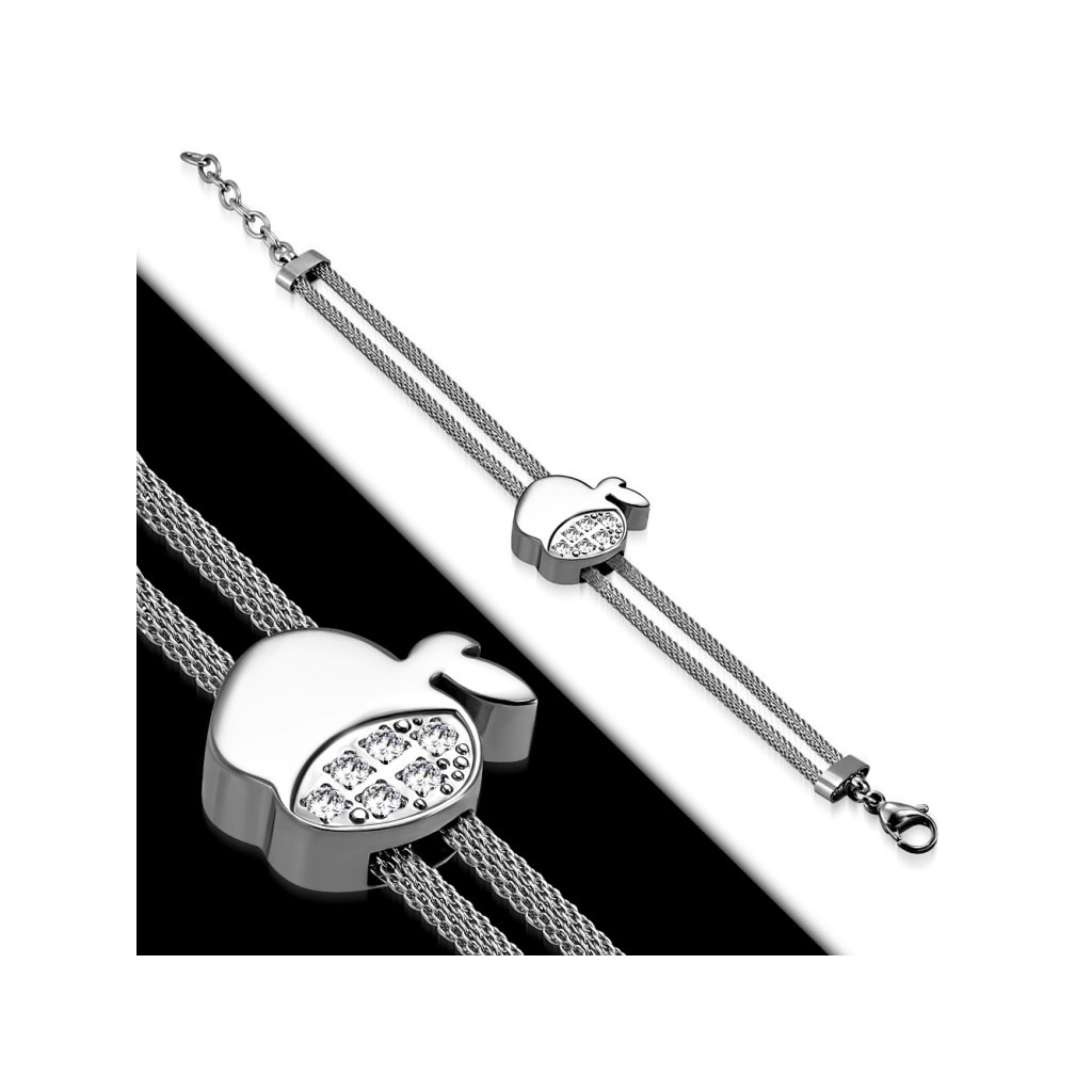 Dámsky náramok vyrobený z chirurgickej ocele. Náramok sa skladá z dvoch náramkov okrúhleho vzoru spojených do jedného. V strede je ozdoba v tvare jabĺčka, ktorého jedna strana je vykladaná očkami čírej farby. Náramok pôsobí jemne a elegantne a je vhodný aj pre mladé dámy. Veľmi ľahko sa dá zladiť s inými doplnkami. Materiál náramku je kvalitná chirurgická oceľ. Tento materiál je pevný a odolný, nemení svoju farbu a nevyžaduje si žiadnu špeciálnu starostlivosť. Je hypoalergénny a vhodný na bežné každodenné nosenie.