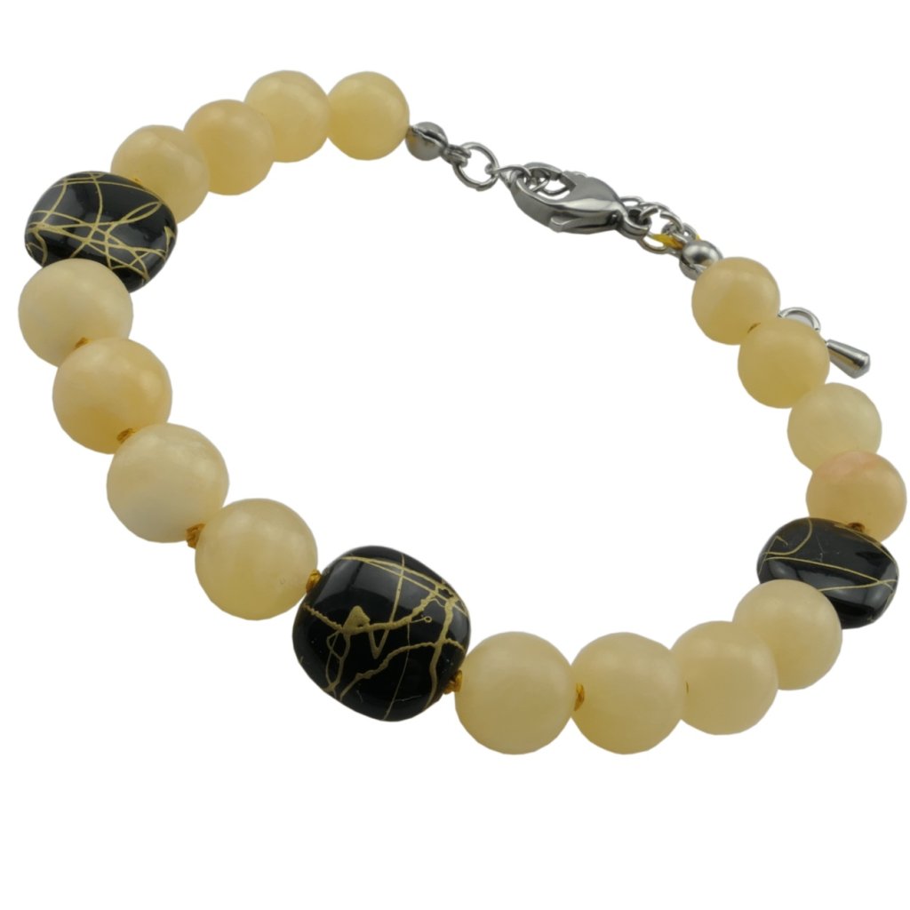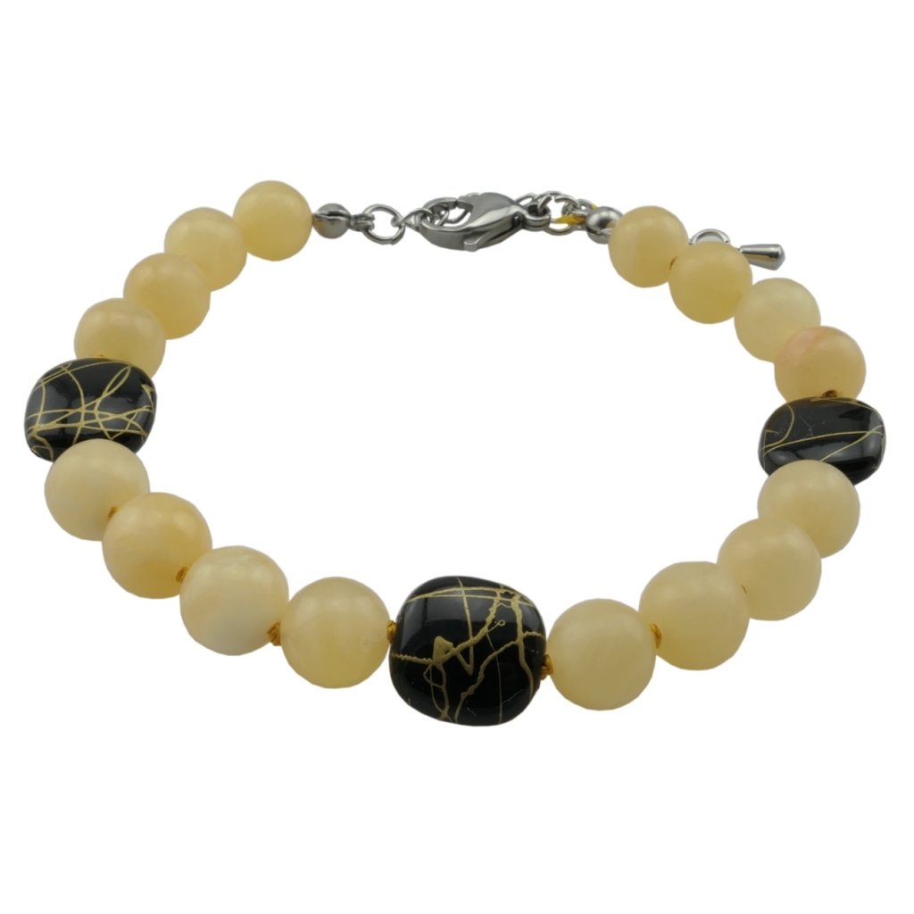 Veľmi zaujímavý dámsky náramok z minerálu Citín v kombinácii korálkami s čierno zlatými korálkami . Polodrahokam Citrín patrí medzi polodrahokami ktoré nevidíte úplne bežne ale je to krásny minerál ktorý dodáva pokoj, pocit bezpečia posilňuje múdrosť a intelekt, sebadôveru, nádej, kreativitu, vytrvalosť, vyrovnanosť . Je to krásny kameň žltej farby. Náramok má klasickú karabínku s predľžovacou retiazkou z chirurgickej ocele.