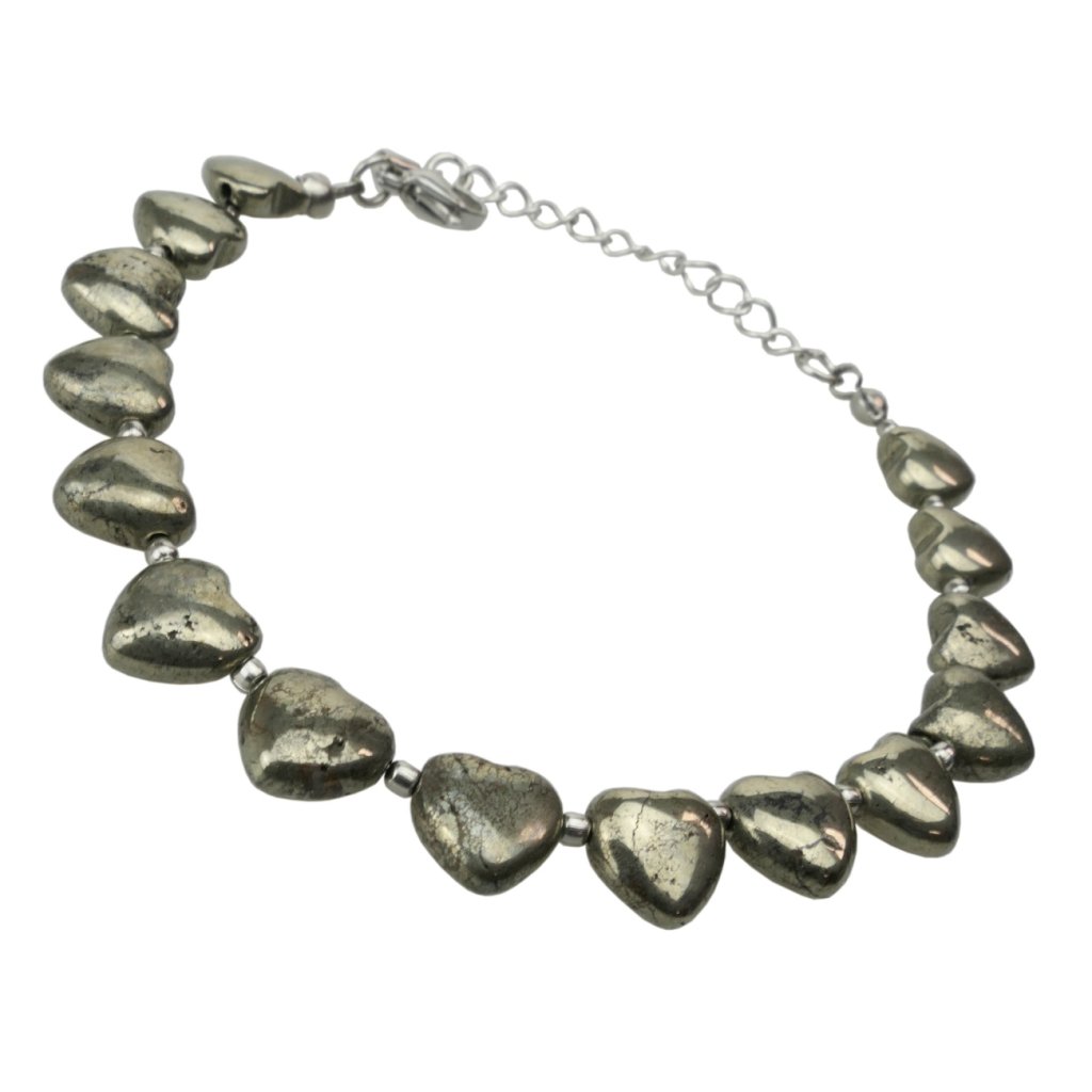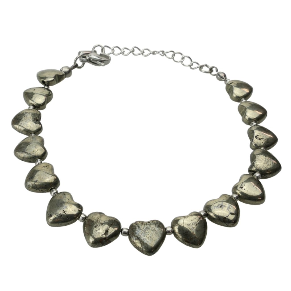 Krásny a romantický dámsky náramok z polodrahokamu Pyrit v kombinácii s chirurgickou oceľou. Korálky Pyritu majú tvar srdiečok a medzi srdiečkami sú malé guličky z chirurgickej ocele. Polodrahokam Pyrit je kameň intelektu. Podporuje sebadôveru a myslenie a logiku. Tak isto stojí za zmienku že pomáha pri plánovaní podnikateľských zámerov. Korálky sú navlečené sú na niti zo 100 % prírodného hodvábu. Zapínanie šperku je na klasickú karabínku s predlžovacou retiazkou, vďaka ktorej si dokážete prispôsobiť jeho dĺžku.