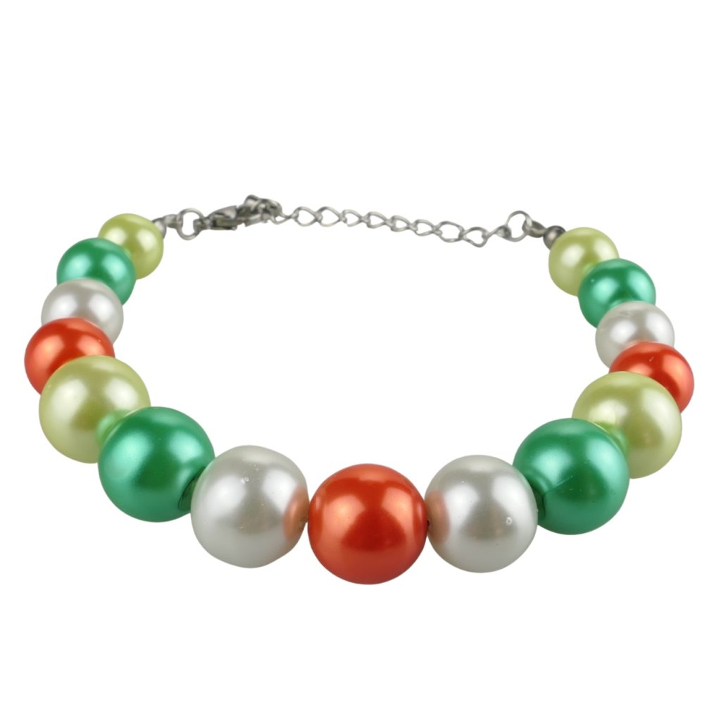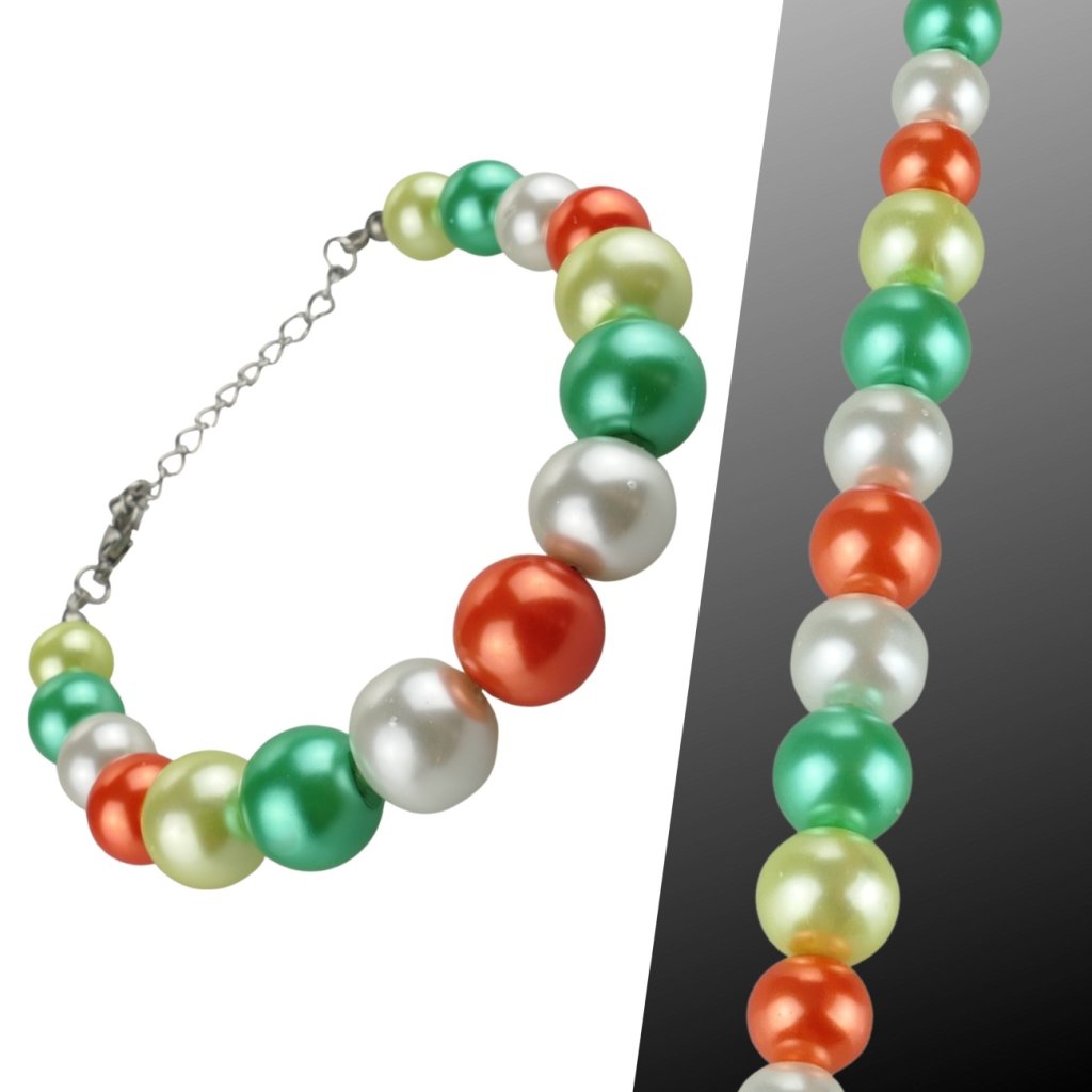Nádherný náramok vyrobený zo sklenených voskovaných perál. Voskované perly sú dokonalé a ich jedinečnosť je v ich povrchovej úprave ktorá vytvára dojem pravej lesklej perly. Naramok sa skladá z koraliek vo veľkosti 12 - 10 - 8 mm. Tento šperk sa ideálne farebne hodí k letným teplým dňom. Je veľmi krásne farebne zladený. Náramok je navlečeni na nity so zapínaním na karabínku s predlžovacou retiazkou. Predlžovacia retiazka, karabínky a samozrejme aj všetky kovové komponenty sú z kvalitnej chirurgickej ocele. Tento krásny náramok je vhodný pre všetky vekové kategórie a hodí sa ako k bežnému outfitu tak aj k slávnostnému spoločenskému.