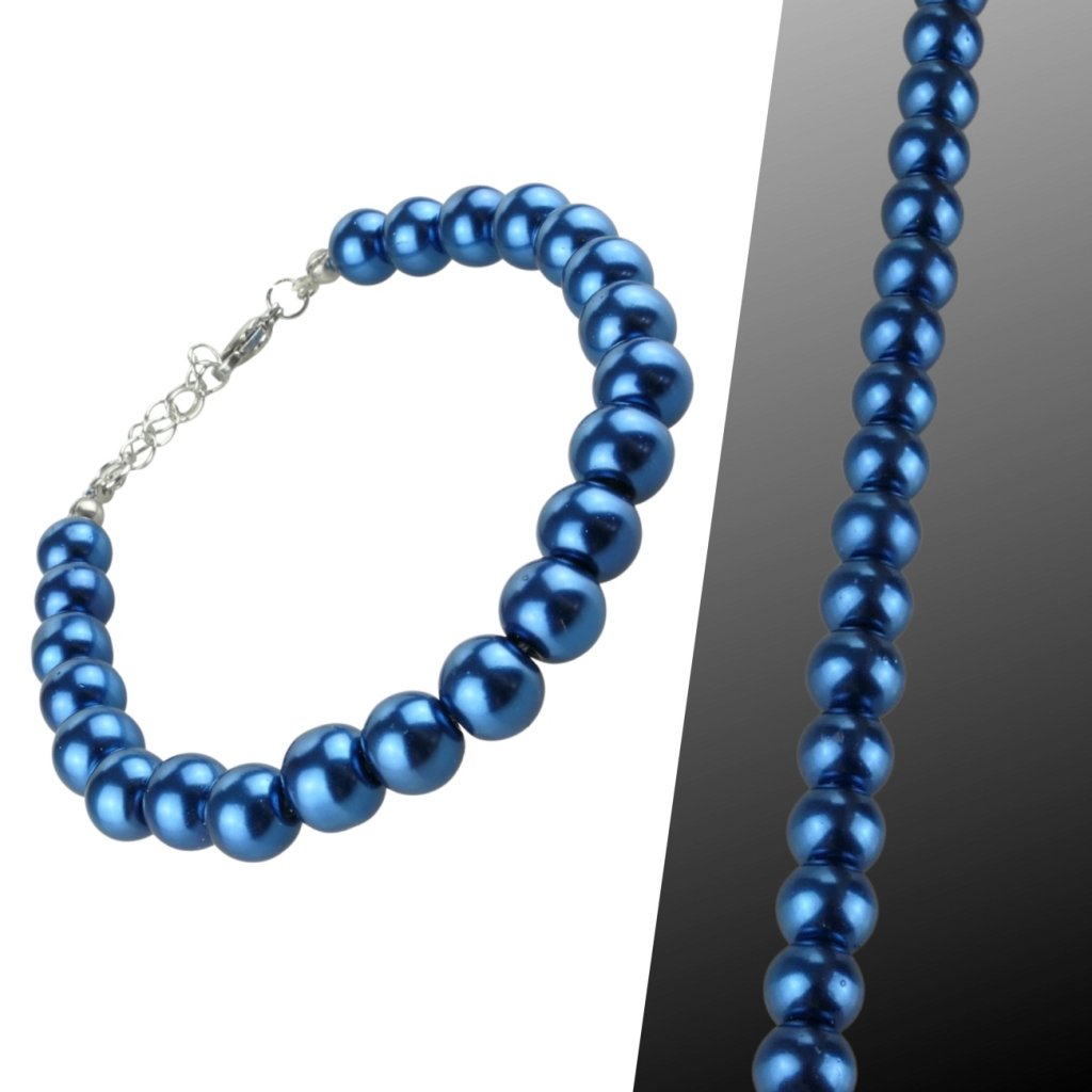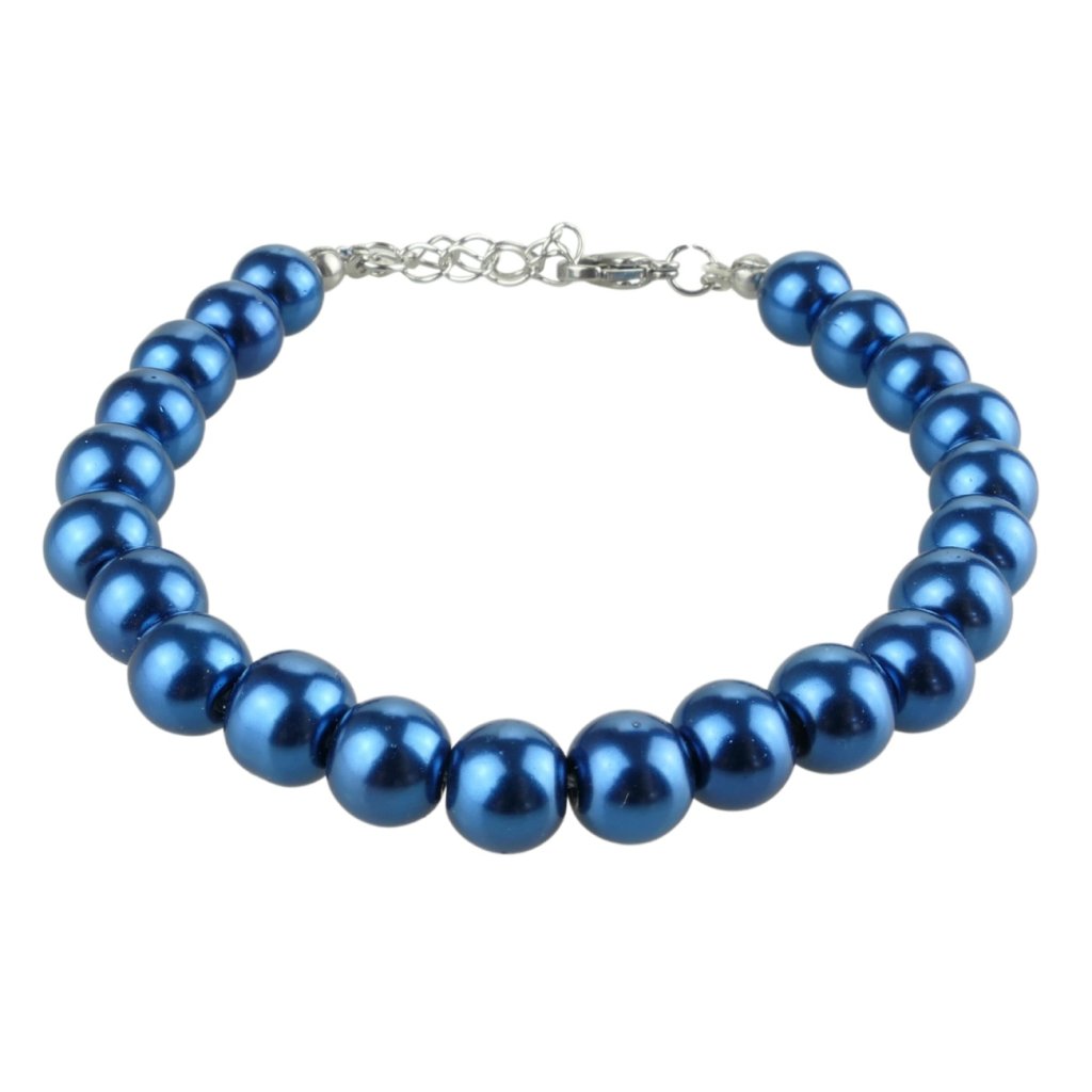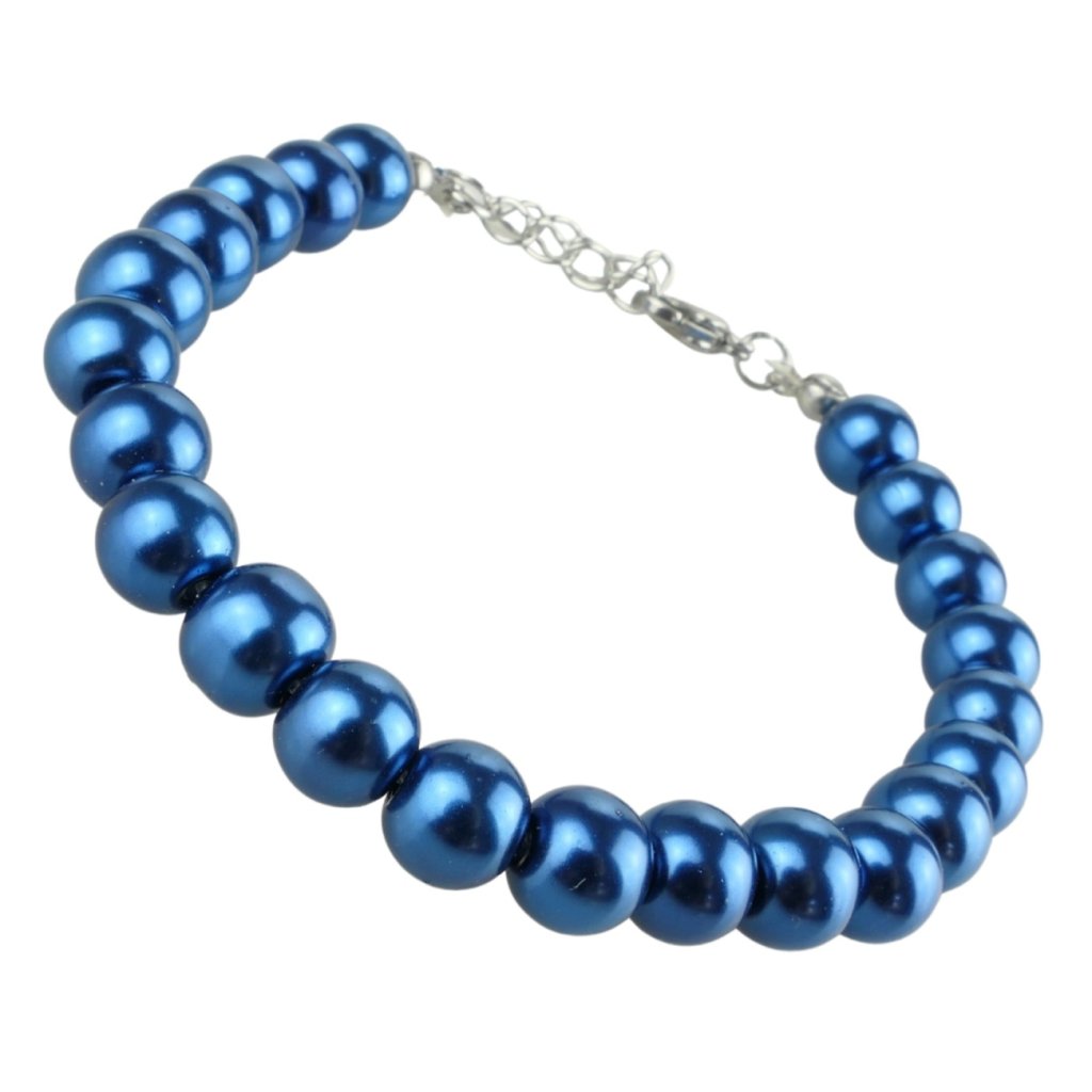 Krásny dámsky náramok z krásnych voskových perál v modrej farbe. Sklenené voskované perly sú dokonalé a ich jedinečnosť je v ich povrchovej úprave ktorá vytvára dojem pravej lesklej perly. Náramok je navlečeni na nity so zapínaním na karabínku s predlžovacou retiazkou. Predlžovacia retiazka, karabínky a samozrejme aj všetky kovové komponenty sú z kvalitnej chirurgickej ocele. Tento krásny náramok je vhodný pre všetky vekové kategórie a hodí sa ako k bežnému outfitu tak aj k slávnostnému spoločenskému.