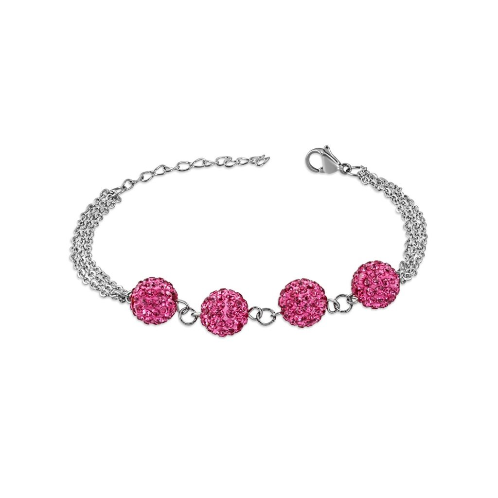 Nádherný náramok Shamballa vyrobený z chirurgickej ocele. Náramok je striebornej farby a skladá sa z troch retiazok spojených do jednej. V strede sú štyri Shamballa guličky ružovej farby. Tie sa krásne lesknú na svetle. Náramok pôsobí elegantne a oživí každý ženský outfit. Je vhodný na bežné každodenné nosenie napríklad do práce, ale aj k slávnostnejším outfitom. Šperk veľmi ľahko doplníte napríklad náušnicami alebo príveskom Shamballa. Materiál chirurgická oceľ je veľmi pevný a odolný a udržiava si svoj lesk, hoci nepotrebuje žiadnu špeciálnu starostlivosť.