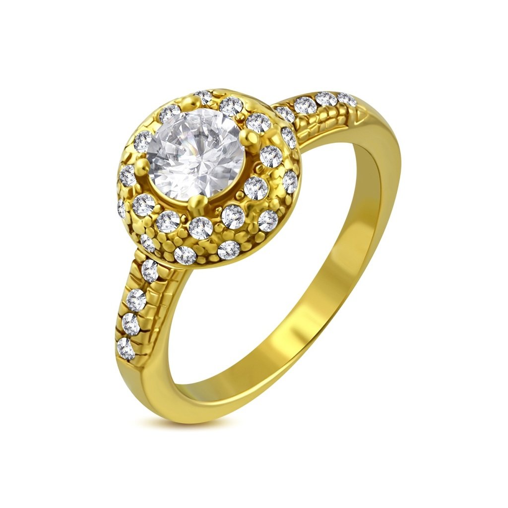 Nádherný dámsky prsteň z chirurgickej ocele v zlatej farbe. Prsteň je zdobený mnohými očkami čírej farby. V strede je kruh posiaty očkami, ktorého dominantnou je väčšie očko v strede kruhu. Prsteň je krásny a skvele doplní každý váš elegantný outfit. Ľahko ho doladíte náušnicami, náramkom alebo príveskom. Materiál prsteňa je kvalitná chirurgická oceľ. Prstene z chirurgickej ocele sú čoraz viac vyhľadávanými medzi šperkami, pretože oceľ nekoroduje, nečerná a je antialergická.
