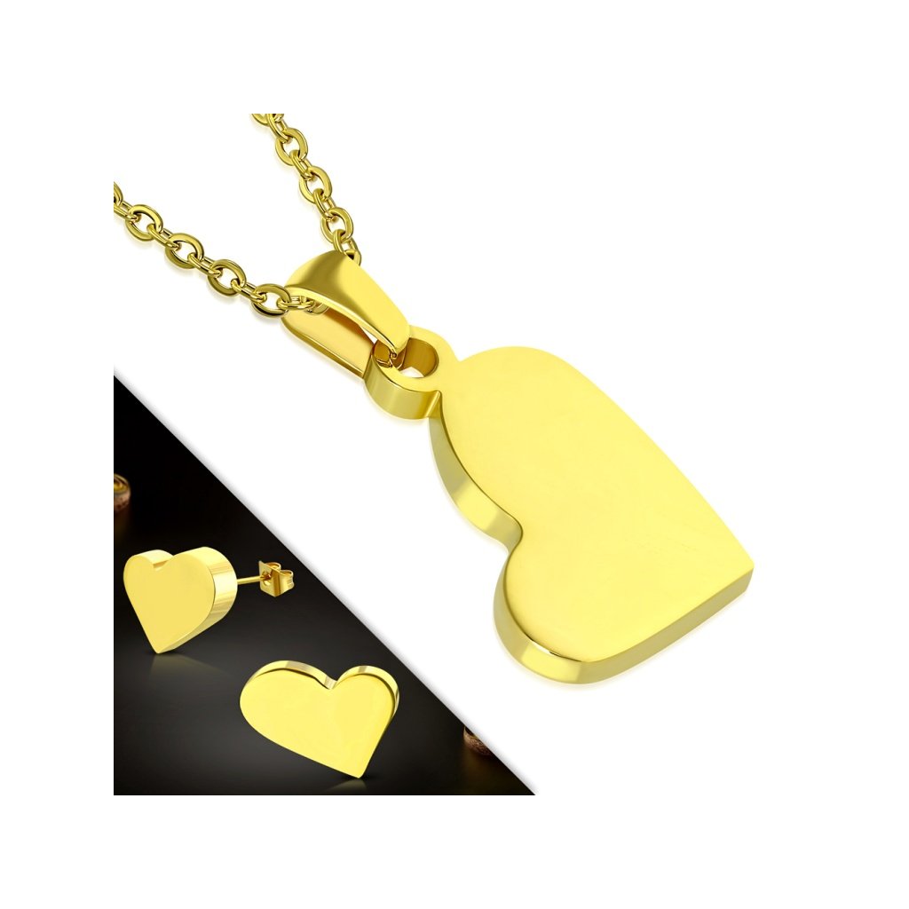 Krásny dámsky set v zlatej farbe vyrobený z chirurgickej ocele. Prívesok má tvar asymetrického plného srdca. Záves na retiazku je na jednej strane srdiečka, čo ešte viac zvýrazňuje jeho nerovnakosť. Náušnice majú rovnakú tvar ako prívesok. Tento set je veľmi jemný a elegantný a je vhodný pre všetky dámy v každom veku. Set si skvele doplníte náramkom v zlatej farbe. Materiál prívesku a náušníc je kvalitná chirurgická oceľ, ktorá je pevná a odolná. Nevyžaduje si žiadnu špeciálnu starostlivosť.