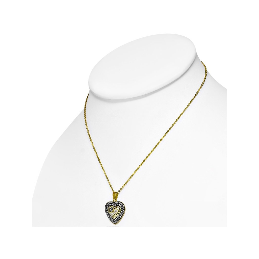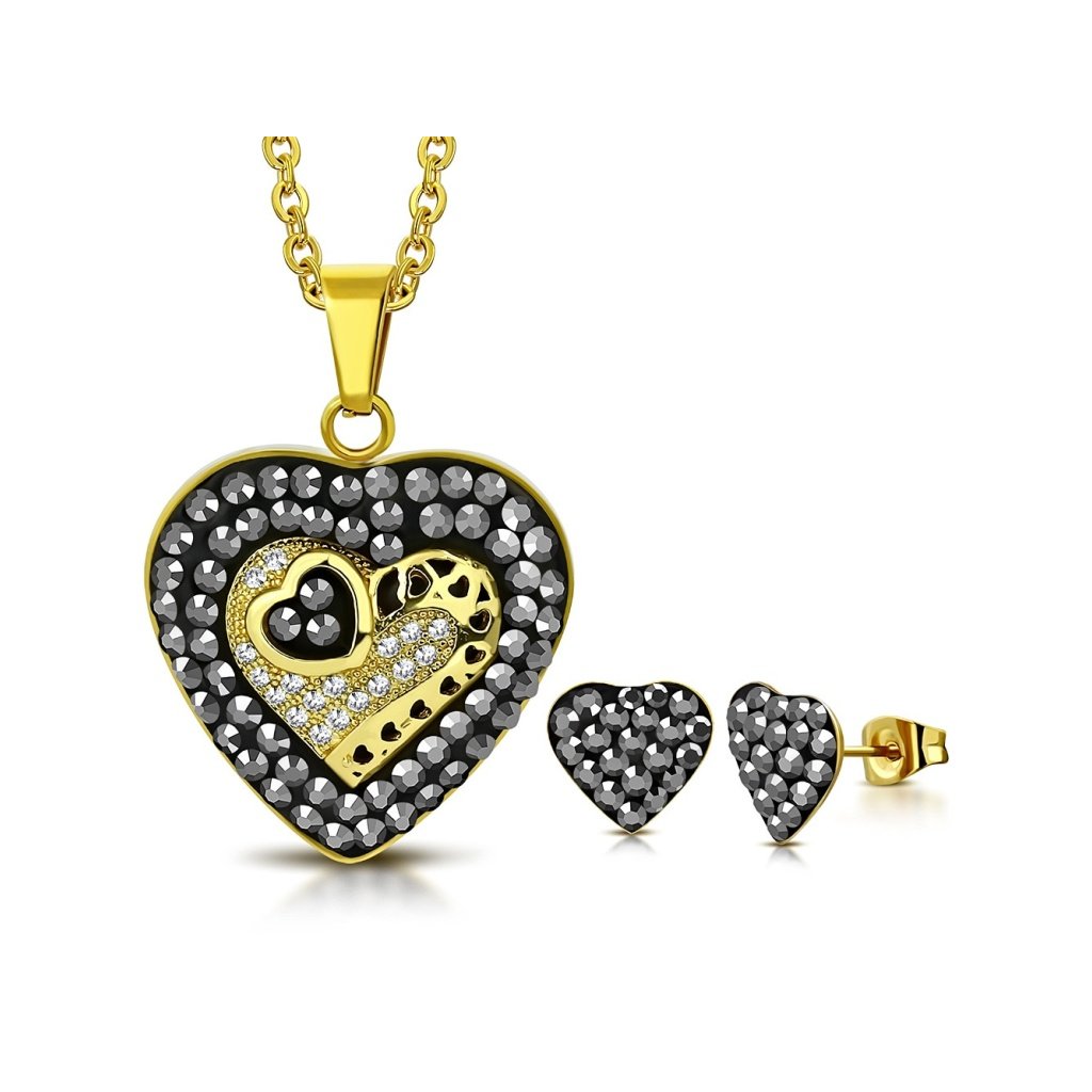 Krásny dámsky set z chirurgickej ocele v zlatej farbe. Prívesok je v tvare srdiečka, ktoré je vykladané čiernymi očkami po obvode. V strede je menšie srdce zdobené čírymi očkami, v ktorom je ešte jedno malinké srdiečko. Prívesok pôsobí veľmi luxusne a kombinácia farieb ho robí zaujímavým doplnok vhodným pre všetky dámy. Náušnice sú v tvare malých srdiečok, ktoré sú vykladané čiernymi očkami, zapínanie majú puzetového typu. Skvele dopĺňajú prívesok a tak tvoria krásny set. Materiál šperku je kvalitná chirurgická oceľ, ktorá je pevný a odolný materiál. Výhoda ocele je to, že je antialergická.