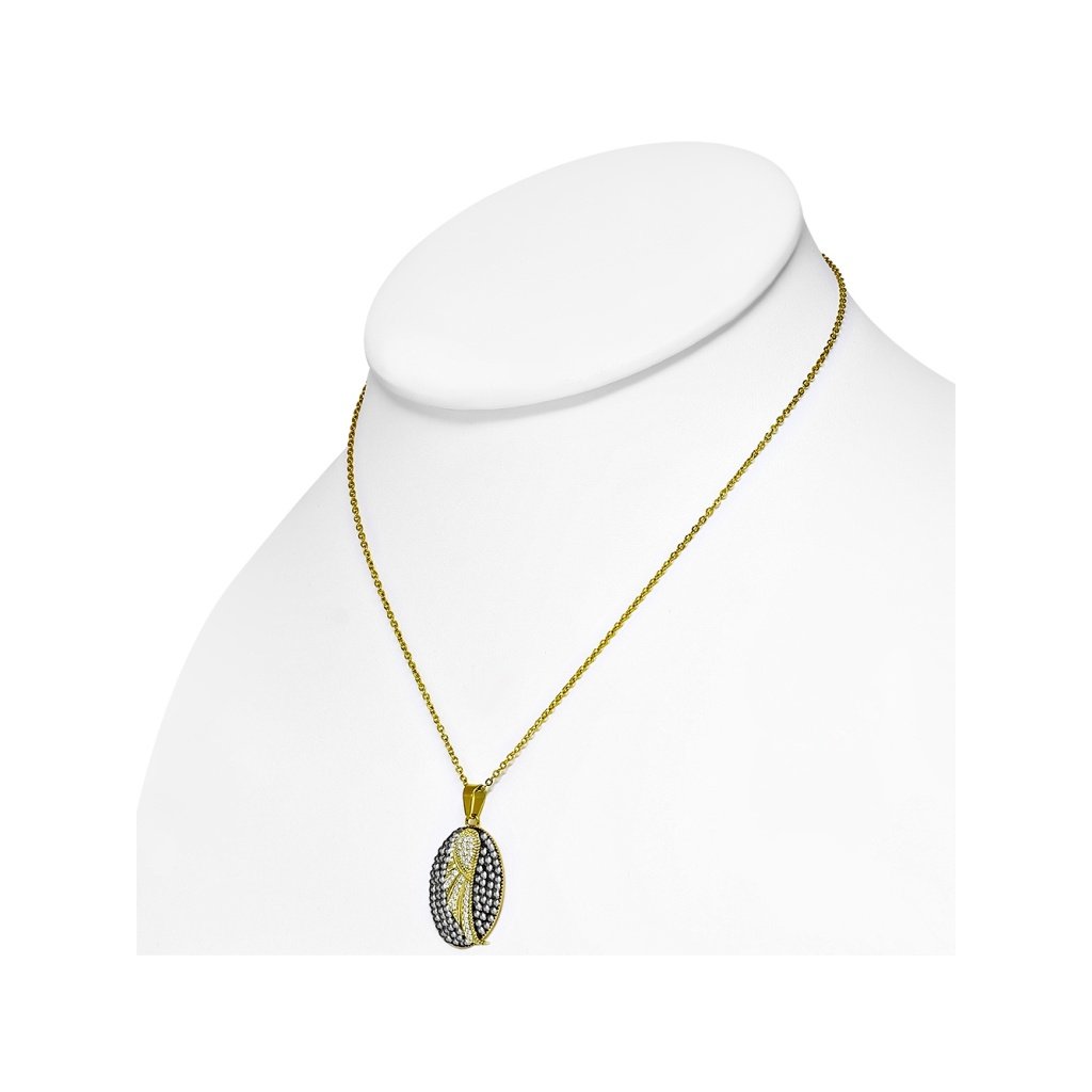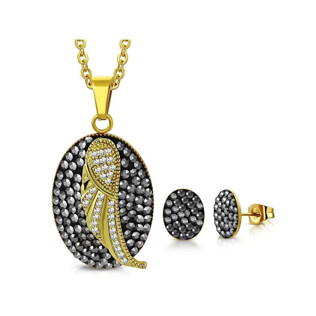 Krásny dámsky set z chirurgickej ocele v zlatej farbe. Prívesok je v tvare oválu, ktorého pozadie je vykladané čiernymi očkami. V strede je anjelské krídlo zlatej farby vykladané čírymi očkami. Anjelské krídla sú obľúbeným motívom šperkov. Prívesok pôsobí veľmi luxusne aj vďaka kombinácii farieb, ktoré ho robia zaujímavým doplnok vhodným pre všetky dámy. Náušnice sú v tvare menšieho oválu, ktoré sú vykladané čiernymi očkami, zapínanie majú puzetového typu. Skvele dopĺňajú prívesok a tak tvoria krásny set. Materiál šperku je kvalitná chirurgická oceľ, ktorá je pevný a odolný materiál. Výhoda ocele je to, že je antialergická.
