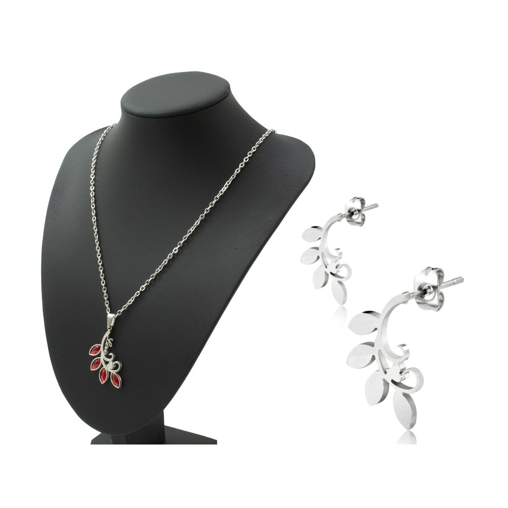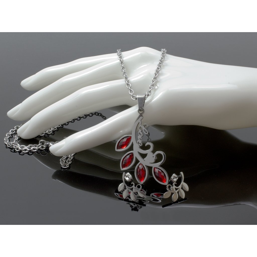 Dámsky set retiazky s príveskom a náušníc z chirurgickej ocele je vyhotovený v romantickom tvare - strom lásky. Lístky stromčeka na prívesku sú zdobené kubickým zirkónom vo vášnivej červenej farbe. Do dokonalosti povyšuje tento prívesok aj úhľadný nápis LOVE. Základná dĺžka retiazky k tomu prívesku je v 45 cm, avšak je možnosť výberu aj z iných variantov dĺžok. K prívesku sú v tomto sete zahrnuté aj drobné napichovacie náušničky, ktoré sa nesú v podobnom dizajne ako prívesok. Sú vyhotovené čisto z kvalitnej chirurgickej ocele s hladkým povrchom. Zapínanie náušníc je puzetové. Materiál chirurgická oceľ Vám zaručí, že šperky budú mať dlhú životnosť, nebudú korodovať či černať. Navyše o set z chirurgickej ocele sa nemusíte špeciálne starať, nakoľko je tento materiál odolný a udržiava si svoju stálu a žiarivú farbu. Tento set sa krásne hodí slečnám aj dámam, ktoré rady nosia symbolické šperky s romantickým nádychom. Set je vynikajúcou voľbou pre každú ženu, ktorá nechce každé ráno premýšľať o tom, ako zladiť jednotlivé kúsky šperkov zo svojej šperkovnice tak, aby dokonale spolu pasovali. Dámsky set - strom života je už vopred zladený, stačí sa ním ozdobiť. Samozrejme, jednotlivé kúsky setu je možné nosiť aj samostatne, alebo ich zladiť k iným šperkom. Fantázii a kreativite sa medze nekladú.