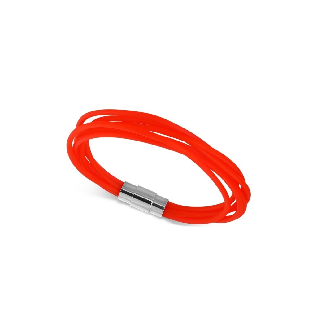 Dámsky náramok silikónový v červenej farbe. Náramok pozostáva zo šiestich tenších náramkov sýtej červenej farby s matným efektom. Náramok je vhodným doplnkom na horúce letné dni a perfektne ním osviežite svoj oufit. Zapínanie náramku je vyrobené z kvalitnej chirurgickej ocele a je magnetické, čo zaručuje ľahkú manipuláciu so šperkom. Chirurgická oceľ je pevný a odolný materiál, ktorý má dlhú živosť a nekoroduje.
