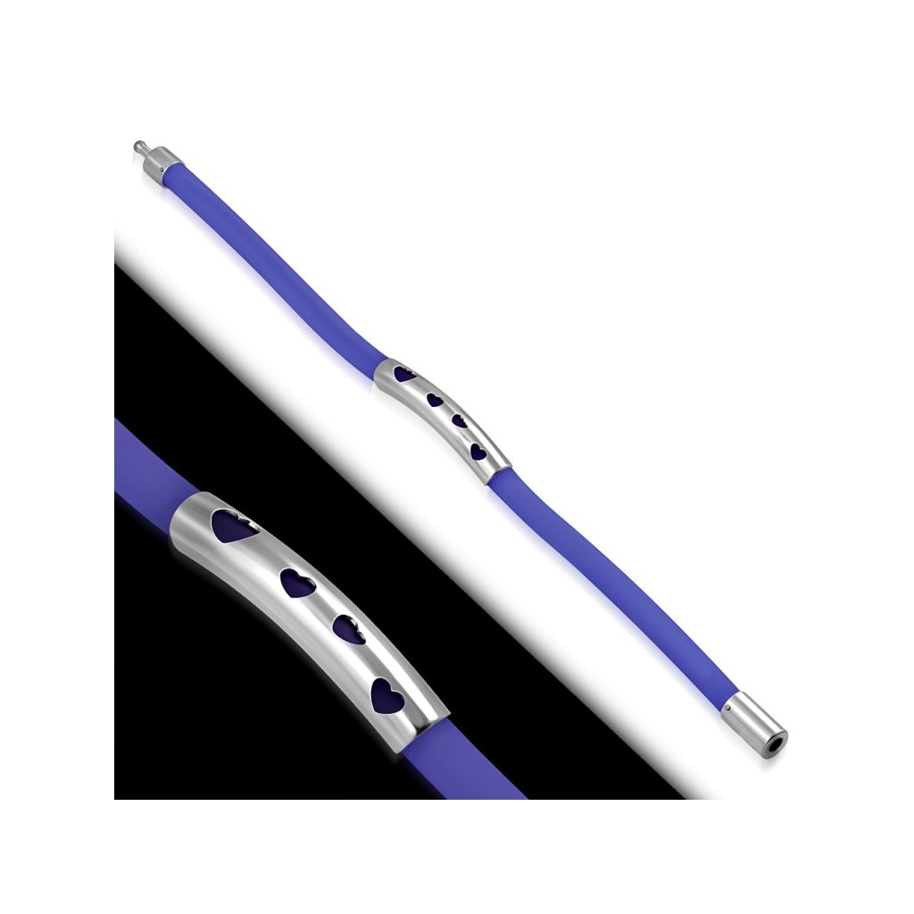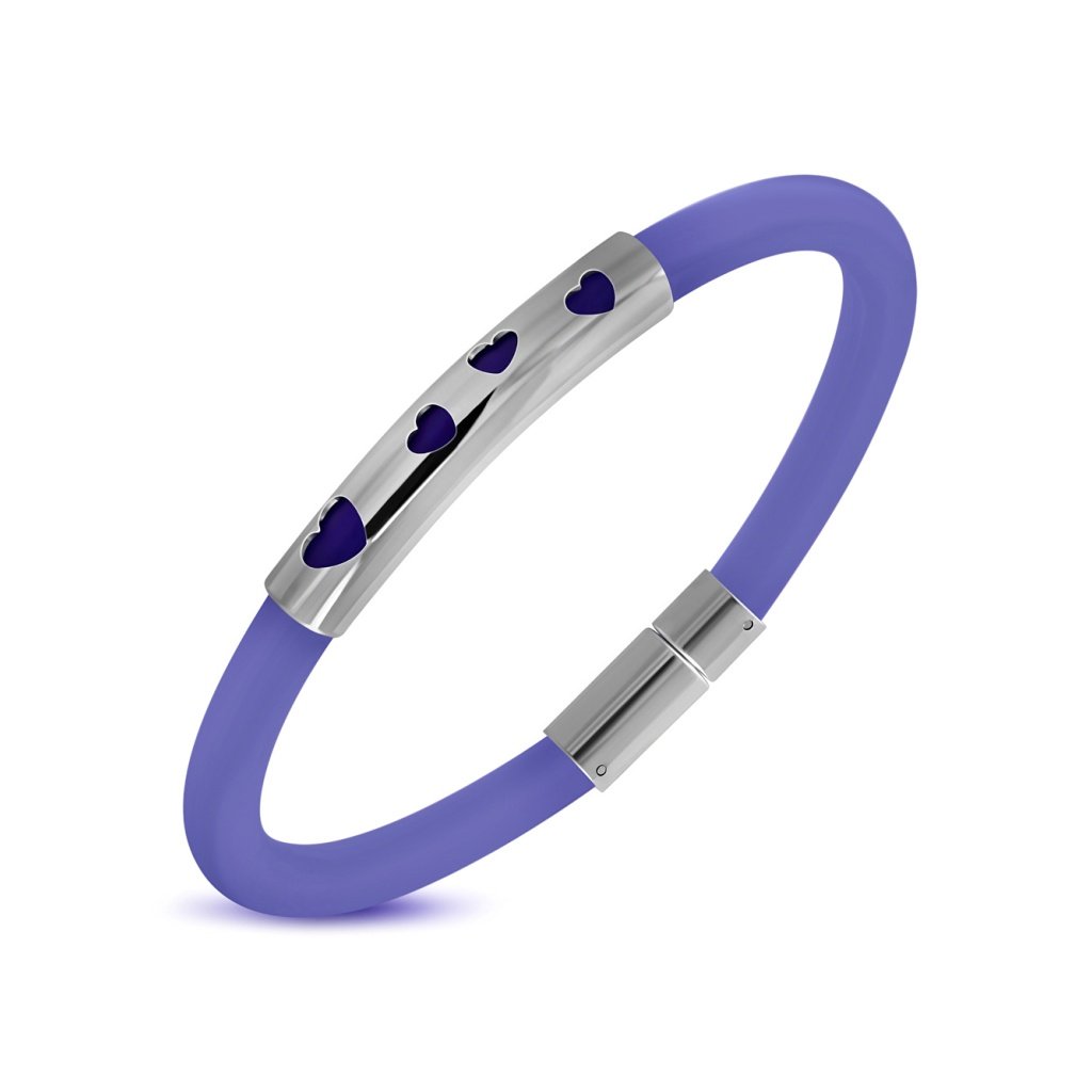 Dámsky silikónový náramok v kombinácií s chirurgickou oceľou. Materiál náramku je silikónová guma fialovej fialovej farby. Náramok má ozdobu z chirurgickej ocele, na ktorej sú vyrezané malé srdiečka. Tento náramok je vhodný aj pre mladé dámy, ktoré si ním doplnia svoj outfit. Zapínanie náramku je vyrobené z kvalitnej chirurgickej ocele, ktorá má dlhú živostnosť, nepotrebuje žiadnu špeciálnu starostlivosť a nekoroduje ani nečerná. Náramok je vhodný na bežné každodenné nosenie.