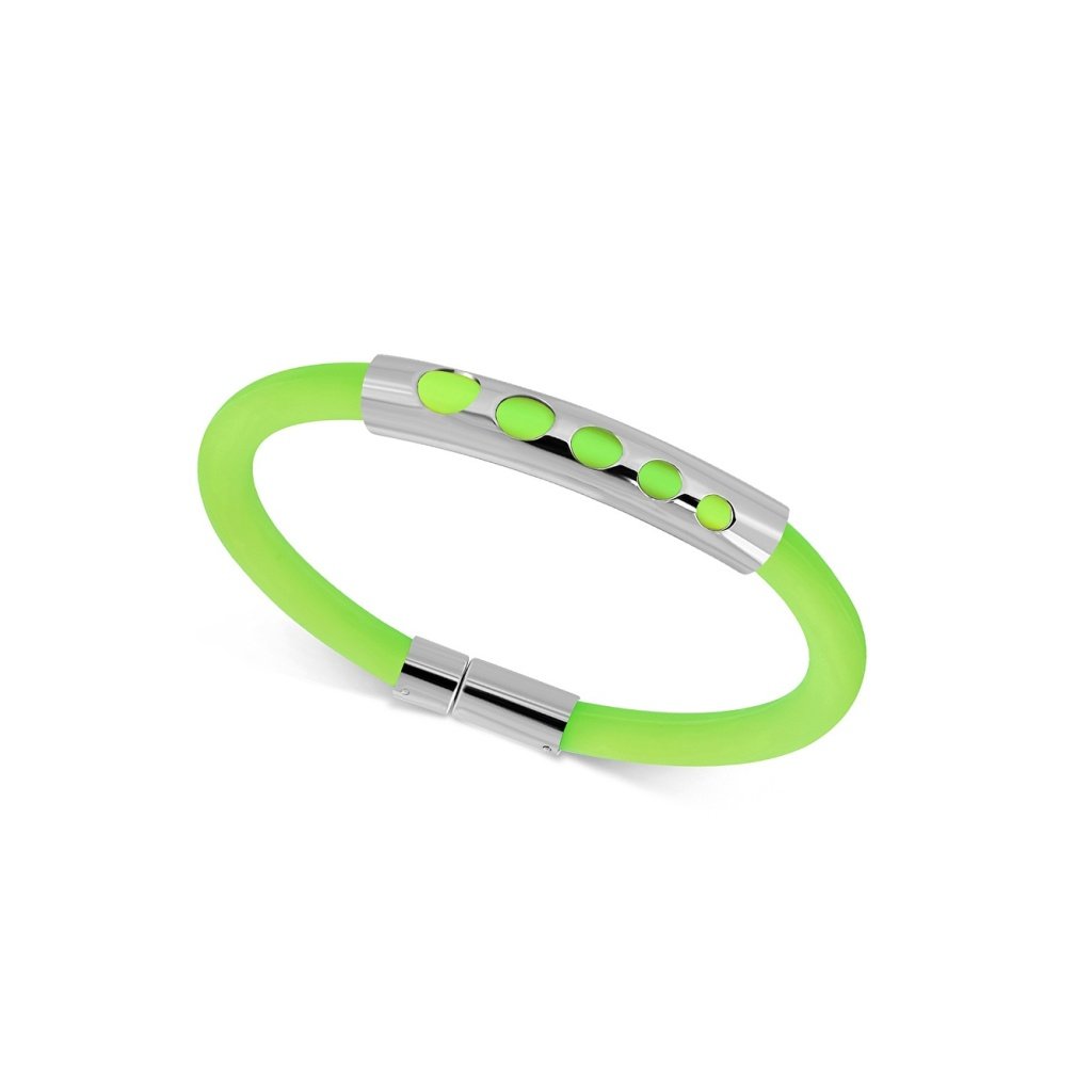 Dámsky silikónový náramok v kombinácií s chirurgickou oceľou. Materiál náramku je silikónová guma, ktorá má sviežu zelenú farbu. Náramok má ozdobu z chirurgickej ocele, z ktorej je vyrobené aj zapínanie náramku. Chirurgická oceľ je kvalitný materiál, ktorý nepotrebuje žiadnu špeciálnu starostlivosť, nekoroduje a nečerná. Náramok je skvelým doplnkom na letné horúce dni a je vhodný na bežné každodenné nosenie.