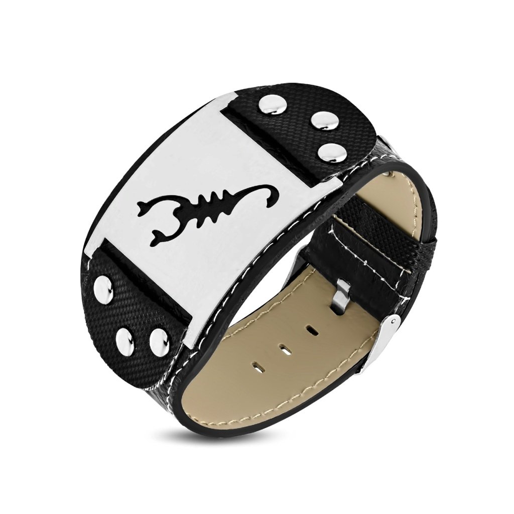Pánsky hrubý náramok z eko kože v kombinácií s chirurgickou oceľou. Náramok je masívnejší a s ozdobou z chirurgickej ocele, na ktorej na znázornený škorpión. Náramok je tak vhodný pre pánov, ktorí sa narodili od 23.10. do 22.11. v znamení škorpión. V časti kde je ozdoba, je náramok širší a po bokoch vybíjaný. Je tiež vhodný pre pánov, ktorí preferujú výraznejšie doplnky. Hoci náramok pôsobí masívne, je veľmi ľahký a eko koža je príjemná na dotyk. Zapínanie náramku je hodnikového typu, vďaka ktorému si viete zvoliť požadovanú veľkosť náramku.