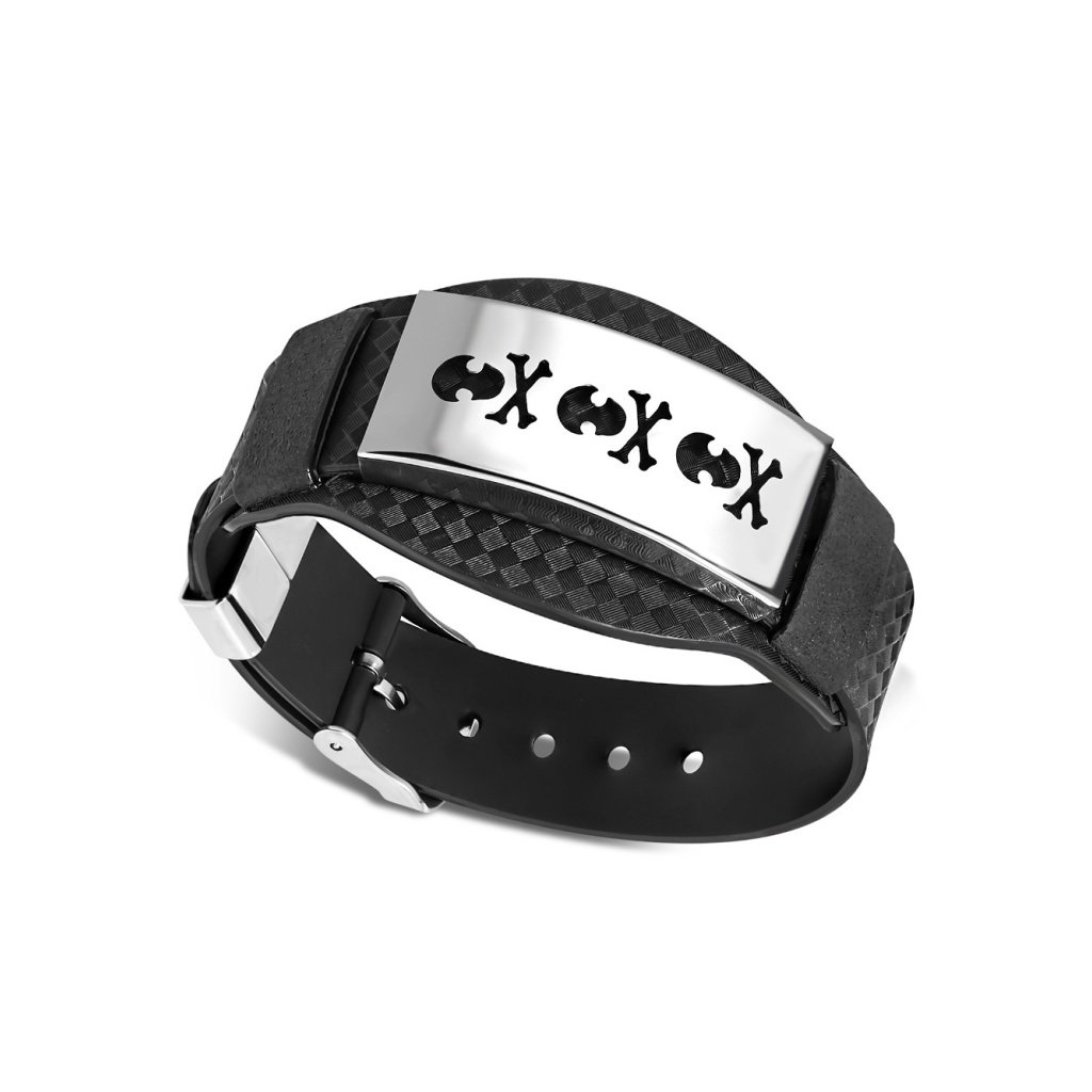 Pánsky náramok vyrobený zo silikónovej gumy. Hrubší náramok je vyrobený zo silikónovej gumy, ktorá má jemný štvorčekový vzor. V strede je náramok ešte širší a zdobený platničkou z chirurgickej ocele s lebkami a kosťami. Tento náramok je vhodný pre pánov, ktoré preferujú motorkársky alebo tzv. pirátsky štýl. Zapínanie má hodinkového typu, čiže pohodlne si ho zapnete na potrebnú veľkosť. Kovové časti zapínania sú taktiež vyrobené z kvalitnej chirurgickej ocele, ktorá nekoroduje ani nečerná. Je to pevný a odolný materiál, ktorý si udržiava svoju farbu aj lesk. Náramok je vhodný na bežné každodenné nosenie.
