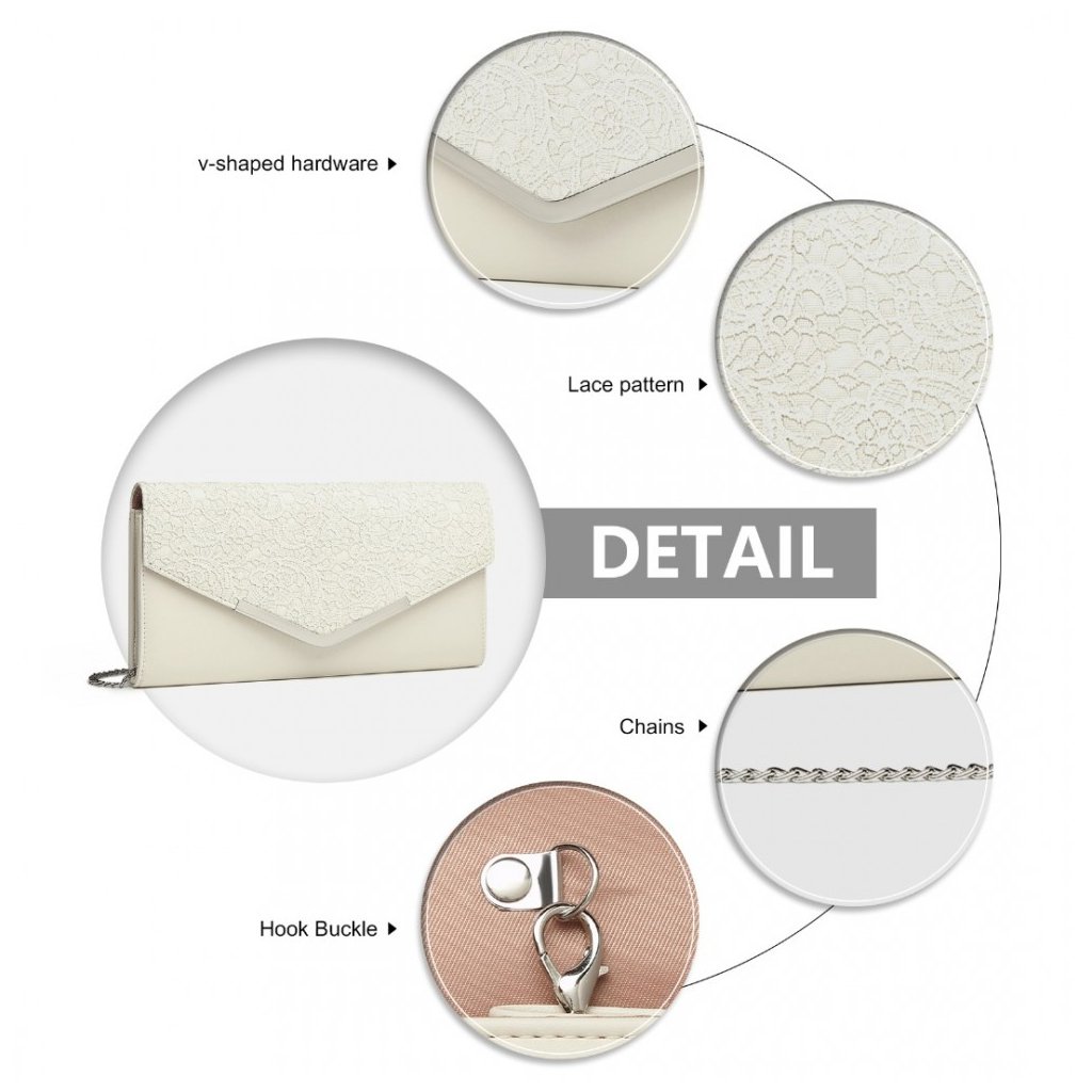 Kabelka je vyrobená z kvalitnej látky, ktorá dotvára jej jemný vzhľad. Jej kompaktné rozmery a tvar sú ideálne pre držanie v ruke a dodávajú vám sofistikovaný vzhľad. Cvok zabezpečuje bezpečné uzatvorenie, a vnútorný priestor poskytuje dostatok miesta pre nevyhnutné drobnosti.