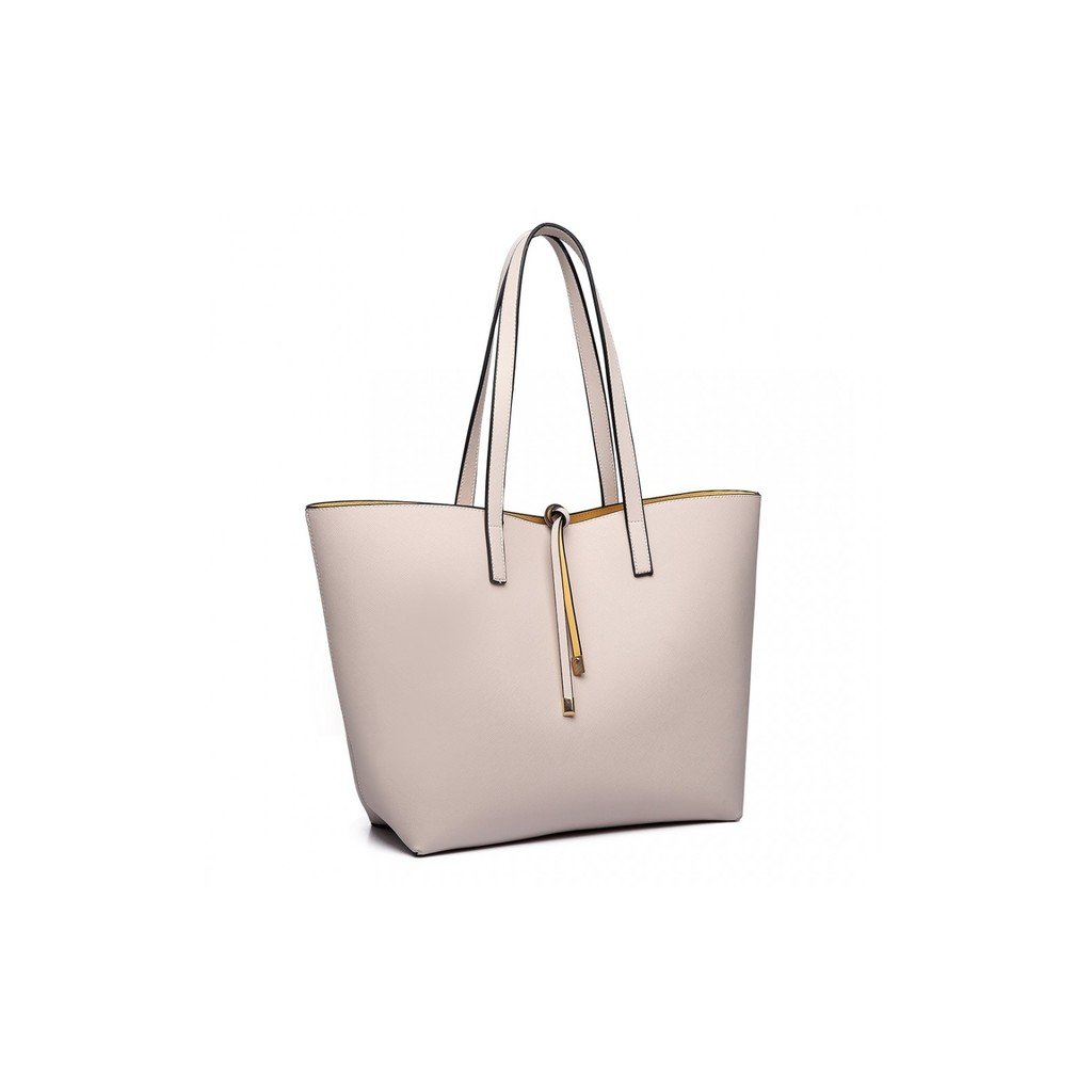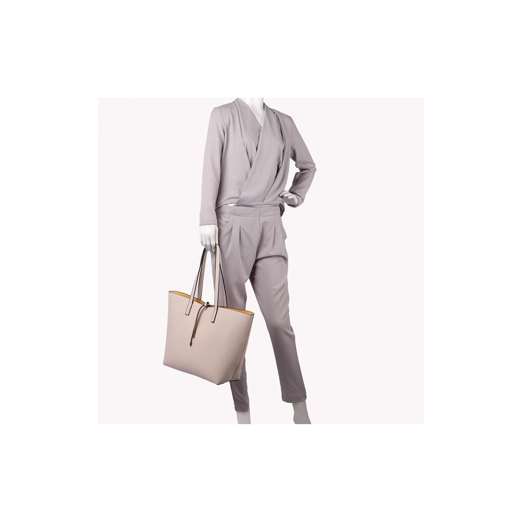 Jedinečná shopper novinka s jednoduchým dizajnom určite osloví dámy, ktoré majú rady módne zmeny. Kabelka je v dvoch farebných prevedeniach a možno ju obojstranne používať. Materiál kabelky je hladká eko koža. Kabelka má priestranný otvorený úložný priestor, do ktorého možno vložiť vrecko na zips. Vrecko dokonale využijete na úschovu dôležitých drobností, ktoré potrebujete mať v bezpečí. Pohodlne sa nosí cez rameno vďaka dlhým uškám cez rameno. Uzatváranie je riešené šnúrkami.
